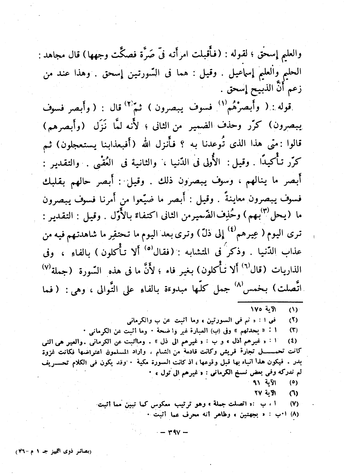 قوله: {وَأَبْصِرْهُمْ فَسَوْفَ يُبْصِرُونَ} ثمّ قال: {وَأَبْصِرْ فَسَوْفَ يُبْصِرُونَ} كرّر وحذف الضمير من الثانى؛ لأَنه لمَّا نَزَل {وَأَبْصِرْهُمْ} قالوا: متى هذا الذى تُوعدنا به؟ فأَنزل الله {أَفَبِعَذَابِنَا يَسْتَعْجِلُونَ} ثم كرّر تأْكيداً. وقيل: الأُولى فى الدّنيا، والثانية فى العُقْبى. والتقدير: أَبصر ما ينالهم، وسوف يبصرون ذلك. وقيل: أَبصر حالهم بقلبك فسوف يبصرون معاينةً. وقيل: أَبصر ما ضيّعوا من أَمرنا فسوف يبصرون ما (يحل بهم) وحُذِف الضّمير من الثانى اكتفاءً بالأَوّل. وقيل: التقدير: ترى اليوم (عِيرهم إِلى ذلّ) وترى بعد اليوم ما تحتقِر ما شاهدتهم فيه من عذاب الدّنيا. وذكر فى المتشابه: {فَقَالَ أَلا تَأْكُلُونَ} بالفاءِ، وفى الذاريات {قَالَ أَلا تَأْكُلُونَ} بغير فاء؛ لأَنَّ ما فى هذه السّورة (جملة اتَّصلت) بخمس جمل كلّها مبدوءَة بالفاءِ على التَّوالى، وهى: {فَمَا