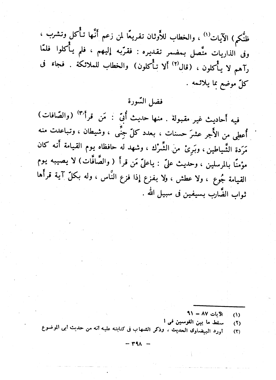 فيه أَحاديث غير مقبولة. منها حديث أُبىّ: مَن قرأَ (والصّافات) أُعطِى من الأَجر عشرَ حسنات، بعدد كلّ جِنِّى، وشيطان، وتباعدت منه مَرَدة الشَّياطين، وبَرِئ من الشِّرْك، وشهد له حافظاه يوم القيامة أَنه كان مؤمناً بالمرسلين، وحديث علىّ: يا علىّ مَن قرأَ (والصَّافَّات) لا يصيبه يوم القيامة جُوع، ولا عطش، ولا يفزع إِذا فزع النَّاس، وله بكلّ آية قرأَها ثواب الضَّارب بسيفين فى سبيل الله.