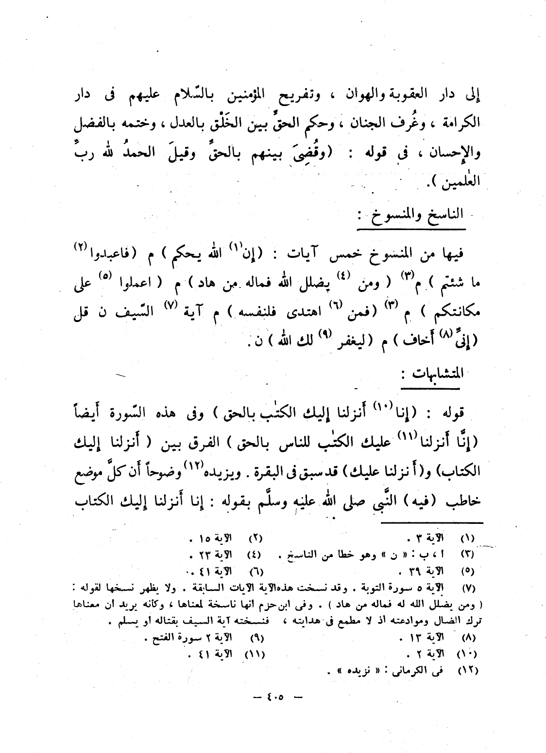 فيها من المنسوخ خمس آيات: {إِنَّ الله يَحْكُمُ} م {فاعبدوا مَا شِئْتُمْ} م {وَمَن يُضْلِلِ الله فَمَا لَهُ مِنْ هَادٍ} م {اعملوا على مَكَانَتِكُمْ} م {فَمَنِ اهتدى فَلِنَفْسِهِ} م آية السّيف ن قل {إني أَخَافُ} م {لِّيَغْفِرَ لَكَ الله} ن.