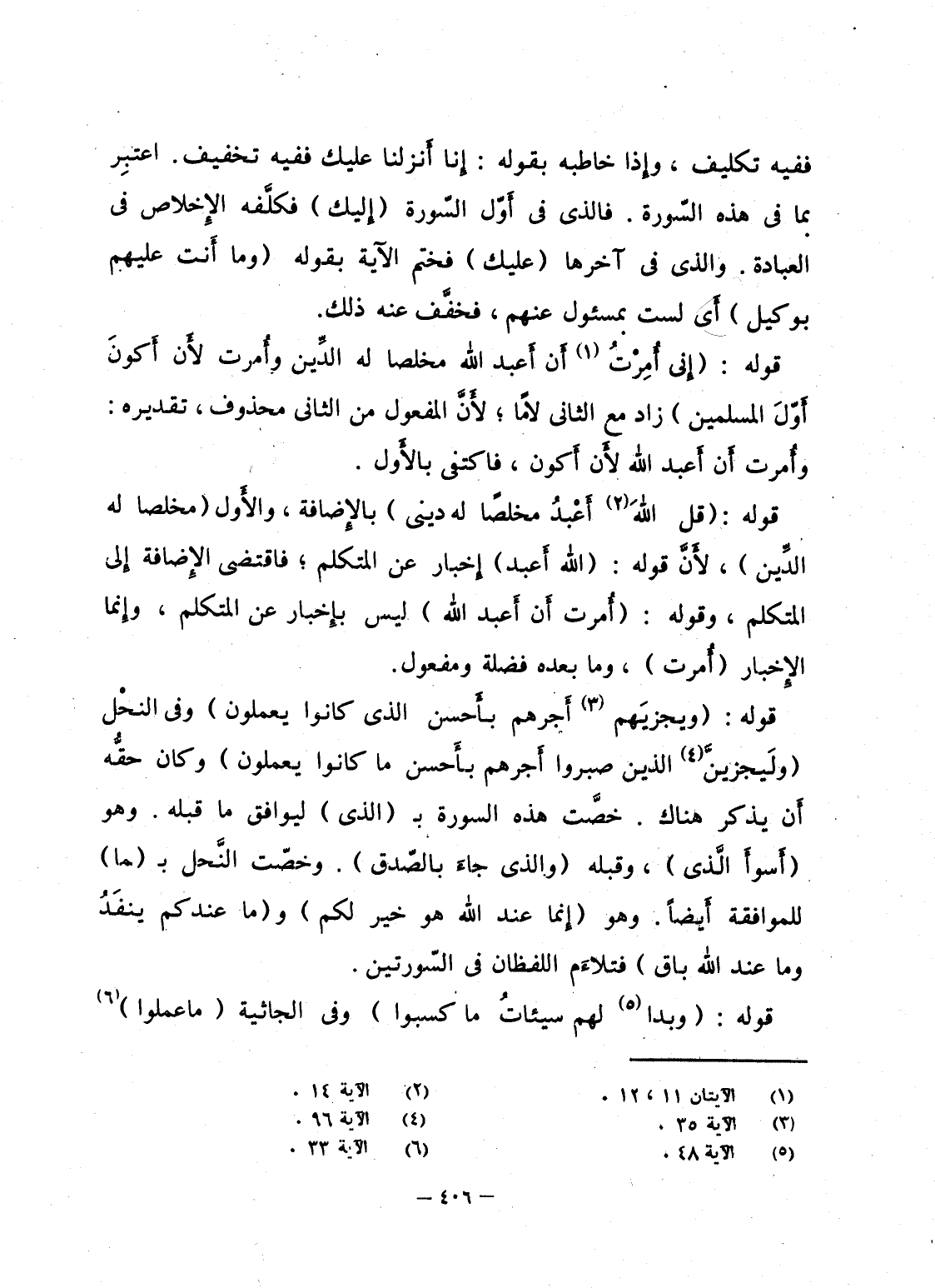 قوله: {قُلِ الله أَعْبُدُ مُخْلِصاً لَّهُ دِينِي} بالإِضافة، والأَول {مُخْلِصاً لَّهُ الدِّيْن} ، لأَنَّ قوله: {الله أَعْبُدُ} إِخبار عن المتكلم؛ فاقتضى الإِضافة إِلى المتكلم، وقوله: {أُمِرْتُ أَنْ أَعْبُدَ الله} ليس بإِخبار عن المتكلم، وإِنما الإِخبار (أُمرت) ، وما بعده فضلة ومفعول.
