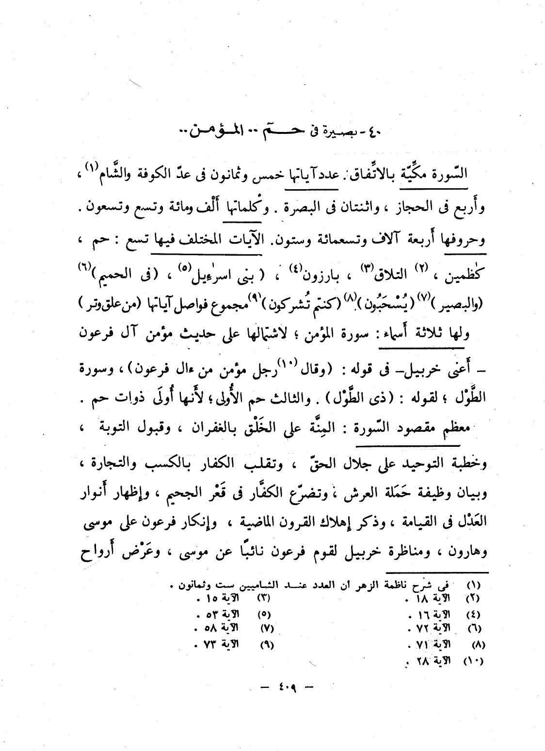 السّورة مكِّيّة بالاتِّفاق. عدد آياتها خمس وثمانون فى عدّ الكوفة والشَّام، وأَربع فى الحجاز، واثنتان فى البصرة. وكلماتها أَلْف ومائة وتسع وتسعون. وحروفها أَربعة آلاف وتسعمائة وستون. الآيات المختلف فيها تسع: حم، كاظمين، التلاق، بارزون، {بني إِسْرَائِيلَ} ، {فِي الحَمِيْمِ} {وَالبَصِيْرِ} {يُسْحَبُونَ} {كُنْتُمْ تُشْرِكُوْنَ} مجموع فواصل آياتها (من علق وتر) .
