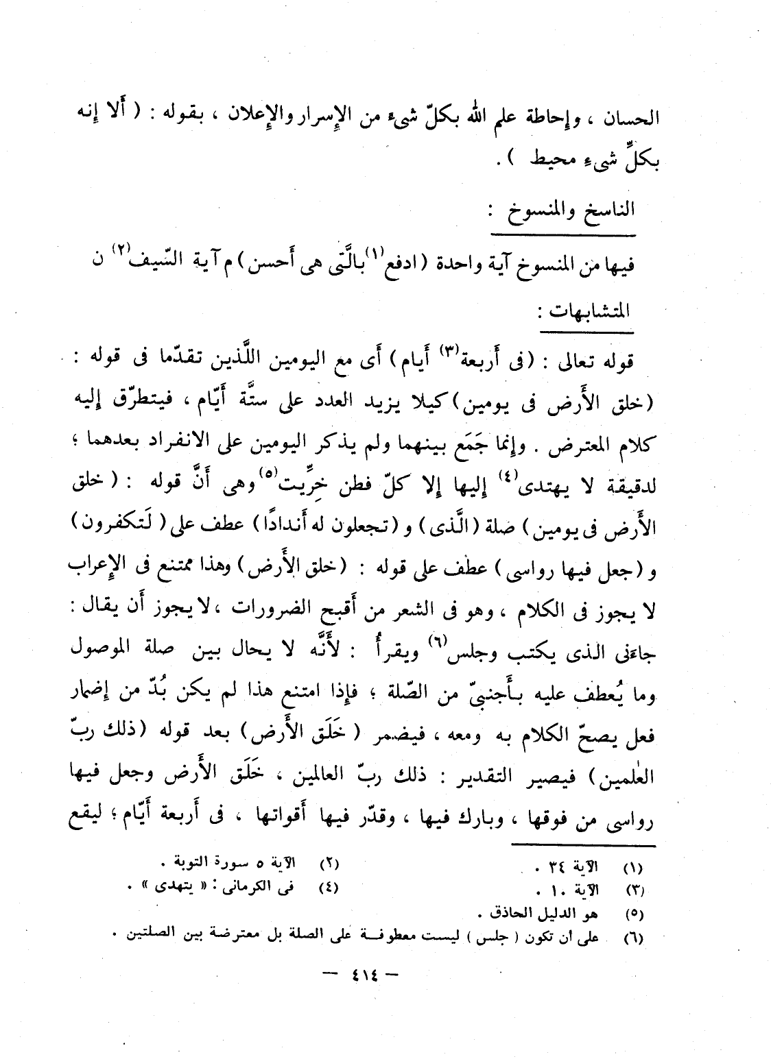 قوله تعالى: {في أَرْبَعَةِ أَيَّامٍ} أَى مع اليومين اللَّذين تقدّما فى قوله: {خَلَقَ الأرض فِي يَوْمَيْنِ} كيلا يزيد العدد على ستَّة أَيّام، فيتطرّق إِليه كلام المعترض. وإِنما جَمَع بينهما ولم يذكر اليومين على الانفراد بعدهما؛ لدقيقة لا يهتدى إِليها إِلا كلّ فطن خِرِّيت وهى أَنَّ قوله: {خَلَقَ الأرض فِي يَوْمَيْنِ} صلة {الذي} و {وَتَجْعَلُونَ لَهُ أَندَاداً} عطف على {لَتَكْفُرُونَ} و {وَجَعَلَ فِيهَا رَوَاسِيَ} عطف على قوله: {خَلَقَ الأرض} وهذا ممتنع فى الإِعراب لا يجوز فى الكلام، وهو فى الشعر من أَقبح الضرورات، لا يجوز أَن يقال: جاءَنى الذى يكتب وجلس ويقرأُ: لأَنَّه لا يحال بين صلة الموصول وما يُعطف عليه بأَجنبىّ من الصّلة؛ فإِذا امتنع هذا لم يكن بُدّ من إِضمار فعل يصحّ الكلام به ومعه، فيضمر {خَلَقَ الأرض} بعد قوله {ذَلِكَ رَبُّ العالمين} فيصير التقدير: ذلك ربّ العالمين، خَلَق الأَرض وجعل فيها رواسى من فوقها، وبارك فيها، وقدّر فيها أَقواتها، فى أَربعة أَيّام؛ ليقع