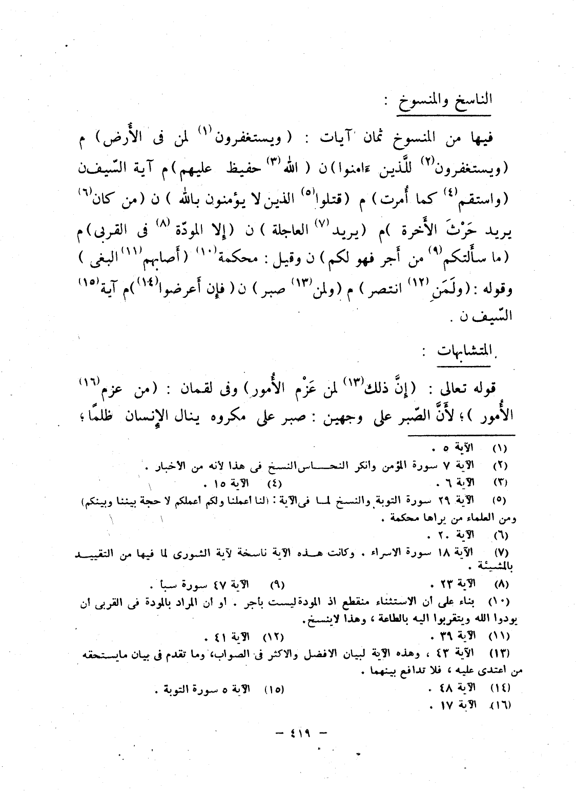 فيها من المنسوخ ثمان آيات: {وَيَسْتَغْفِرُونَ لِمَن فِي الأرض} م {وَيَسْتَغْفِرُونَ لِلَّذِينَ آمَنُواْ} ن {الله حَفِيظٌ عَلَيْهِمْ} م آية السّيف ن {واستقم كَمَآ أُمِرْتَ} م {قَاتِلُواْ الذين لاَ يُؤْمِنُونَ بالله} ن {مَن كَانَ يُرِيدُ حَرْثَ الآخرة} م {يُرِيدُ العاجلة} ن {إِلاَّ المودة فِي القربى} م {مَا سَأَلْتُكُم مِّن أَجْرٍ فَهُوَ لَكُمْ} ن وقيل: محكمة {أَصَابَهُمُ البغي} وقوله: {وَلِمَنِ انْتَصَرَ} م {وَلَمَنْ صَبَرَ} ن {فَإِنْ أَعْرَضُواْ} م آية السّيف ن.