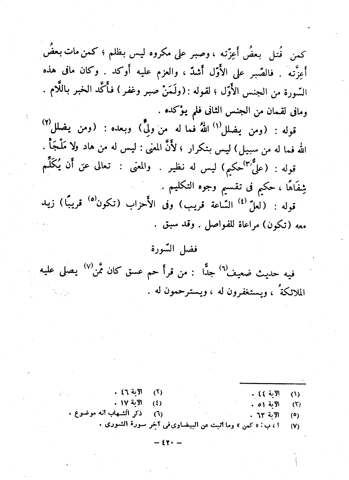كمن قُتل بعضُ أَعِزّته، وصبر على مكروه ليس بظلم؛ كمن مات بعضُ أَعِزَّته. فالصّبر على الأَوّل أَشدّ، والعزم عليه أَوكد. وكان ما فى هذه السّورة من الجنس الأَوّل؛ لقوله: {وَلَمَنْ صَبَرَ وَغَفَرَ} فأَكَّد الخبر باللاَّم. وما فى لقمان من الجنس الثانى فلم يؤكده.