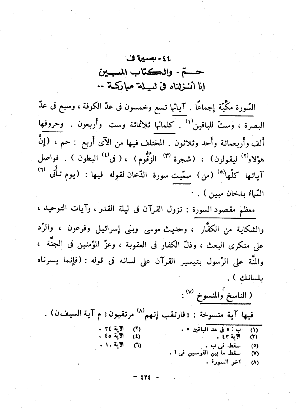 السّورة مكِّيّة إِجماعاً. آياتها تسع وخمسون فى عدّ الكوفة، وسبع فى عدّ البصرة، وستّ للباقين. كلماتها ثلاثمائة وست وأَربعون. وحروفها أَلف وأَربعمائة وأَحد وثلاثون. المختلف فيها من الآى أَربع: حم، {إِنَّ هاؤلاء لَيَقُولُونَ} ، {إِنَّ شَجَرَةَ الزقوم} ، {فِي البطون} . فواصل آياتها كلّها (من) سمّيت سورة الدّخان لقوله فيها: {يَوْمَ تَأْتِي السمآء بِدُخَانٍ مُّبِينٍ} .