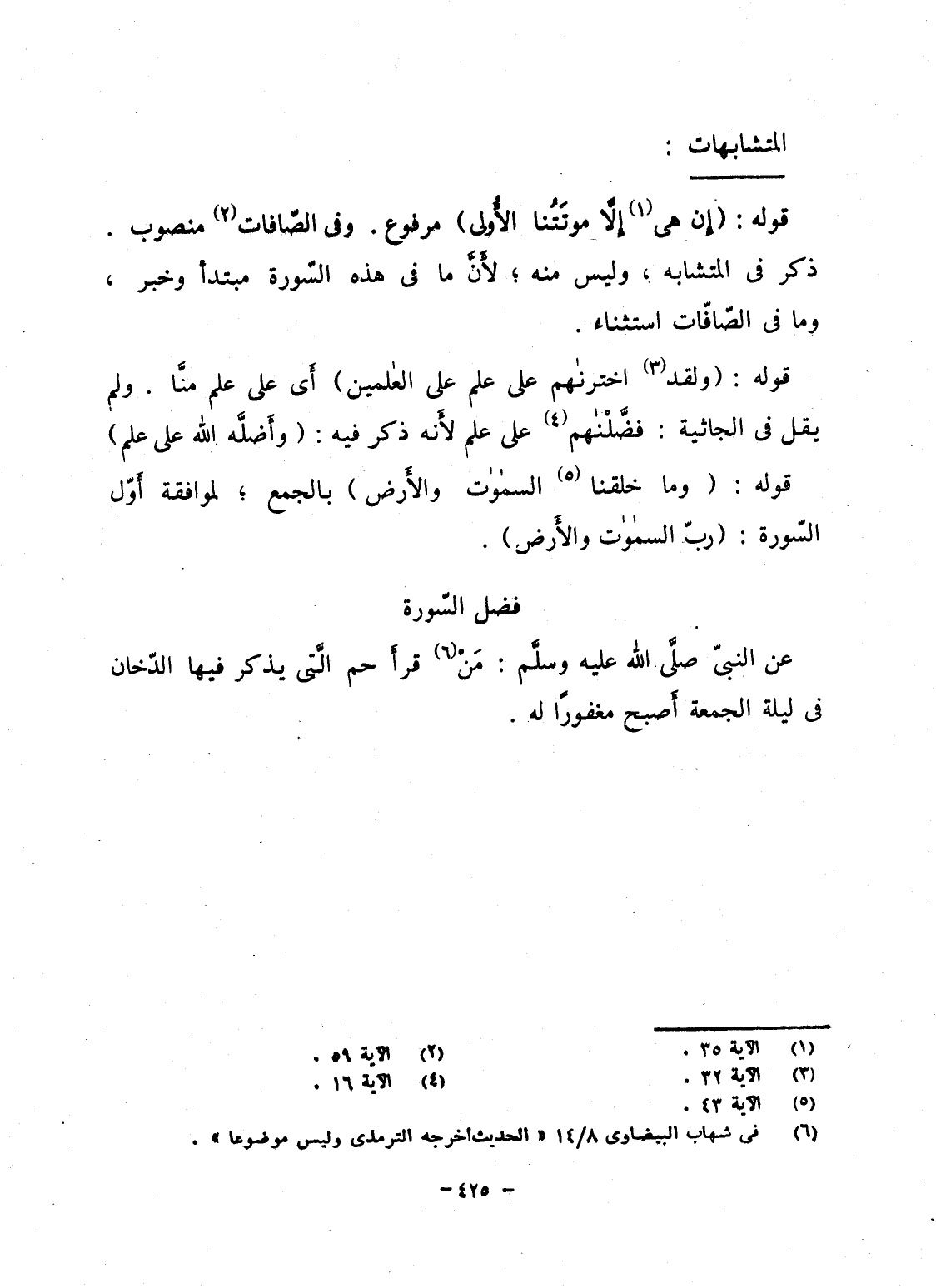 قوله: {إِنْ هِيَ إِلاَّ مَوْتَتُنَا الأولى} مرفوع. وفى الصّافات منصوب. ذكر فى المتشابه، وليس منه؛ لأَنَّ ما فى هذه السّورة مبتدأ وخبر، وما فى الصّافّات استثناء.