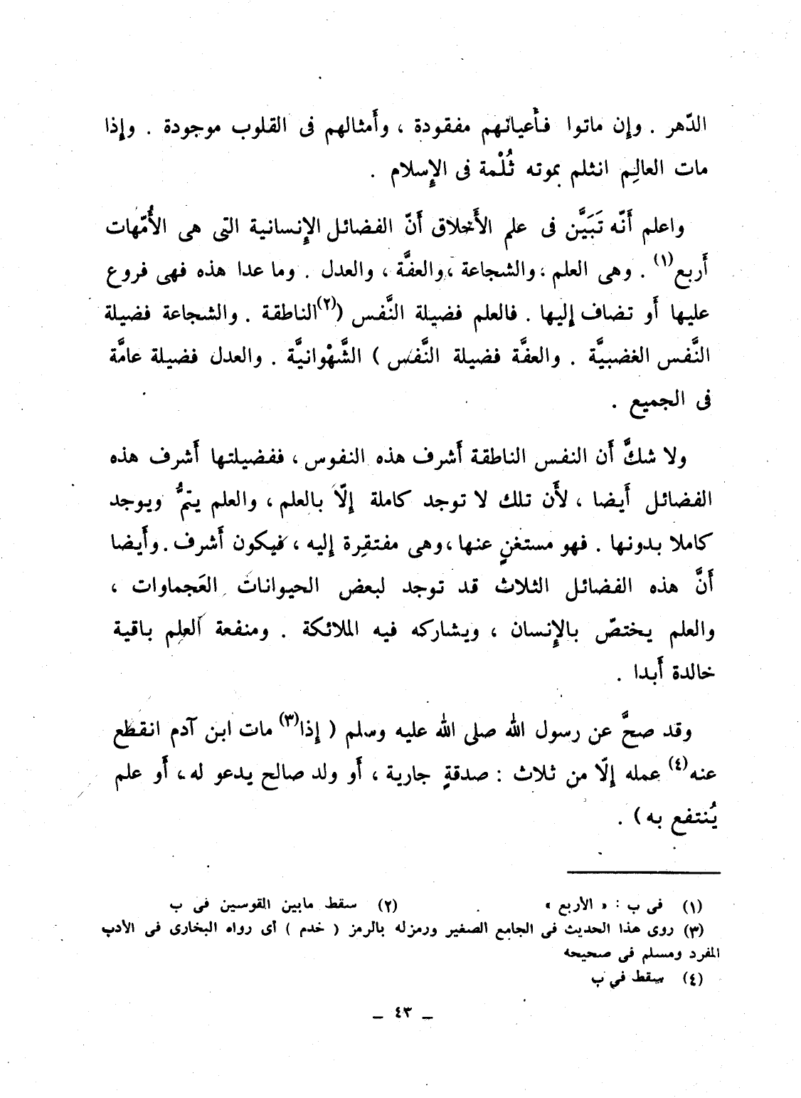 واعلم أَنّه تَبَيَّن فى علم الأَخلاق أَنّ الفضائل الإِنسانية التى هى الأُمّهات أَربع. وهى العلم، والشجاعة، والعفَّة، والعدل. وما عدا هذه فهى فروع عليها أَو تضاف إِليها. فالعلم فضيلة النَّفس (الناطقة. والشجاعة فضيلة النَّفس الغضبيَّة. والعفَّة فضيلة النَّفس) الشَّهْوانيَّة. والعدل فضيلة عامَّة فى الجميع.