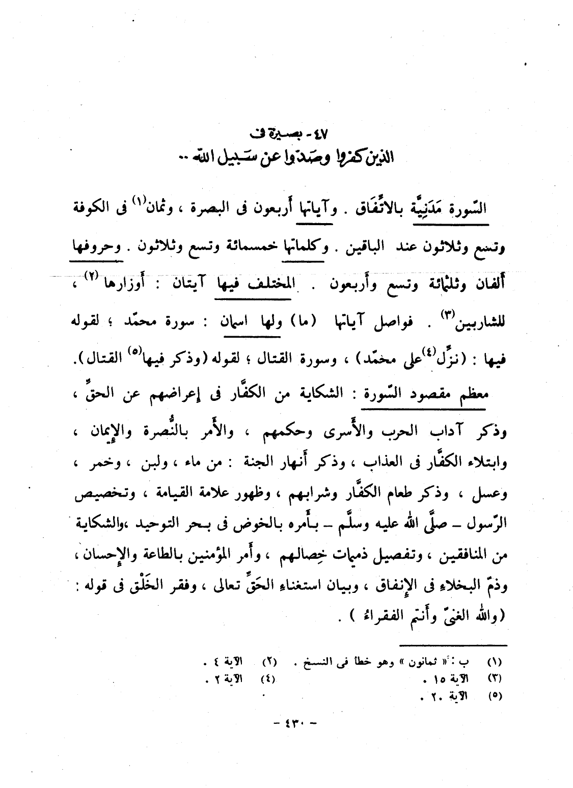السّورة مَدَنِيَّة بالاتِّفَاق. وآياتها أَربعون فى البصرة، وثمان فى الكوفة وتسع وثلاثون عند الباقين. وكلماتها خمسمائة وتسع وثلاثون. وحروفها أَلفان وثلثمائة وتسع وأَربعون. المختلف فيها آيتان: أَوزارها، للشاربين. فواصل آياتها (ما) ولها اسمان: سورة محمّد؛ لقوله فيها: {نُزِّلَ على مُحَمَّدٍ} ، وسورة القتال؛ لقوله {وَذُكِرَ فِيهَا القتال} .