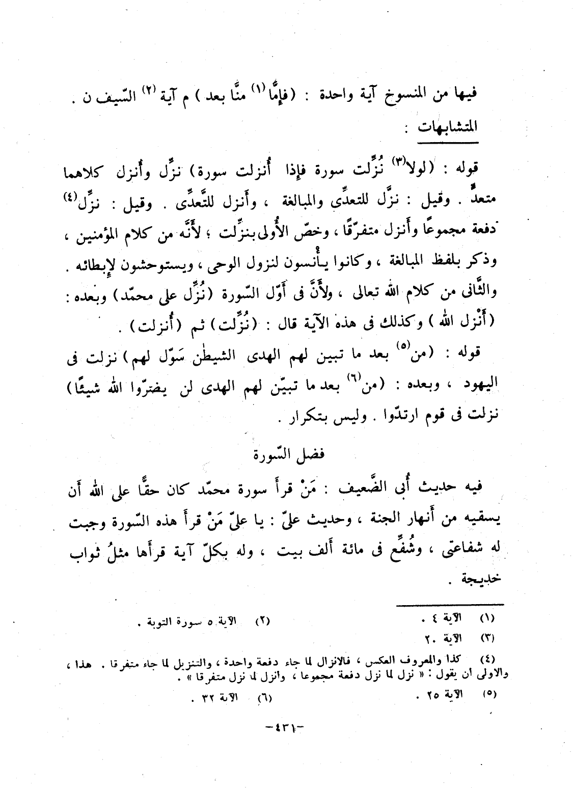 قوله: {لَوْلاَ نُزِّلَتْ سُورَةٌ فَإِذَآ أُنزِلَتْ سُورَةٌ} نزِّل وأُنزل كلاهما متعدٍّ. وقيل: نزَّل للتعدِّى والمبالغة، وأَنزل للتَّعدِّى. وقيل: نزِّل دفعة مجموعاً وأَنزل متفرّقًا، وخصّ الأُولى بنزِّلت؛ لأَنَّه من كلام المؤمنين، وذكر بلفظ المبالغة، وكانوا يأْنسون لنزول الوحى، ويستوحشون لإِبطائه. والثَّانى من كلام الله تعالى، ولأَنَّ فى أَوّل السّورة {نُزِّلَ على مُحَمَّدٍ} وبعده: {أَنزَلَ الله} وكذلك فى هذه الآية قال: {نُزِّلَتْ} ثم {أَنزَلَت} .