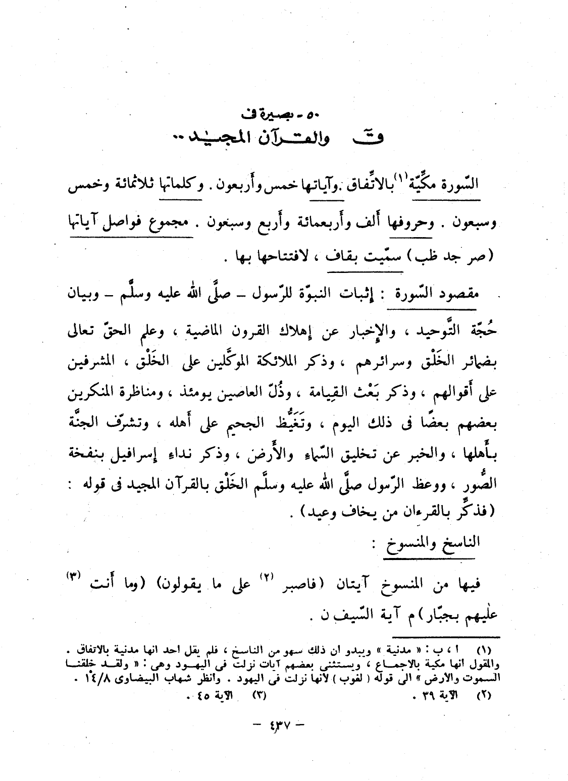 السّورة مكِّيَّة بالاتِّفاق. وآياتها خمس وأَربعون. وكلماتها ثلاثمائة وخمس وسبعون. وحروفها أَلف وأَربعمائة وأَربع وسبعون. مجموع فواصل آياتها (صر جد ظب) سمّيت بقاف، لافتتاحها بها.