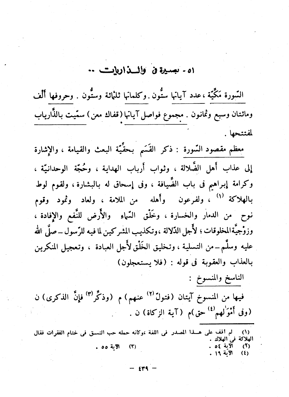 معظم مقصود السّورة: ذكر القَسَم بحقِّيّة البعث والقيامة، والإِشارة إِلى عذاب أَهل الضَّلالة، وثواب أَرباب الهداية، وحُجّة الوحدانيّة، وكرامة إِبراهيم فى باب الضِّيافة، وفى إِسحاق له بالبشارة، ولقوم لوط بالهلاكة، ولفرعون وأَهله من الملامة، ولعاد وثمود وقوم نوح من الدمار والخسارة، وخَلْق السّماءِ والأَرض للنَّفع والإِفادة، وزوْجيَّة المخلوقات؛ لأَجل الدّلالة، وتكذيب المشركين لما فيه للرّسول - صلَّى الله عليه وسلَّم - من التسلية، وتخليق الخَلْق لأَجل العبادة، وتعجيل المنكرين بالعذاب والعقوبة فى قوله: {فَلاَ تَسْتَّعْجِلُوْنَ} .