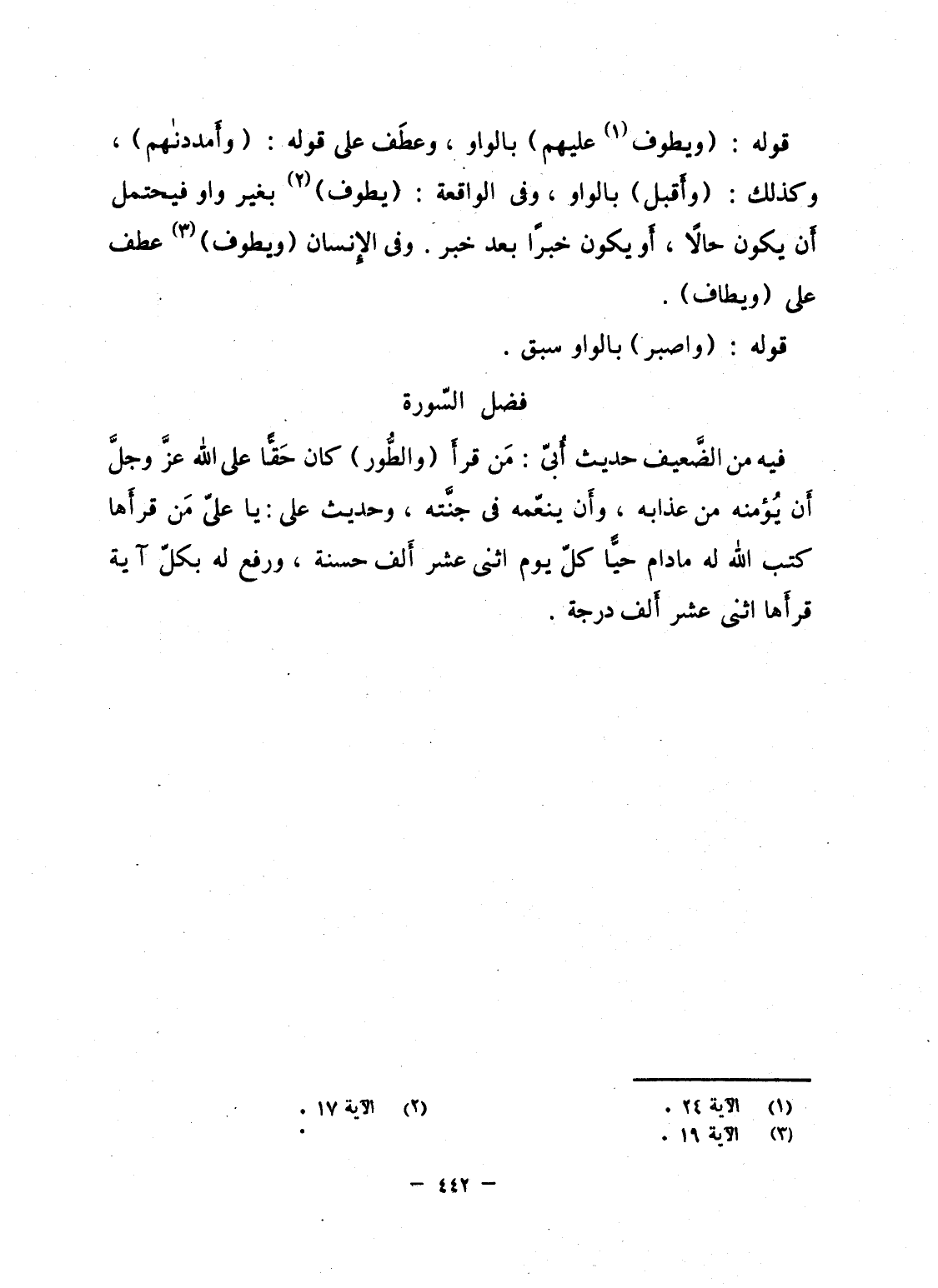 فيه من الضَّعيف حديث أُبىّ: مَن قرأَ (والطُّور) كان حَقّاً على الله عزَّ وجلَّ أَن يُؤمنه من عذابه، وأَن ينعّمه فى جنَّته، وحديث على: يا علىّ مَن قرأَها كتب الله له ما دام حيّاً كلّ يوم اثنى عشر أَلف حسنة، ورفع له بكلّ آية قرأَها اثنى عشر أَلف درجة.