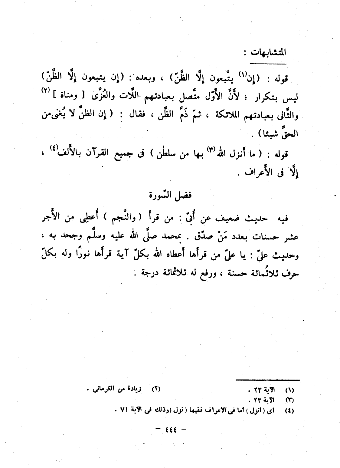 قوله: {إِن يَتَّبِعُونَ إِلاَّ الظن} ، وبعده: {إِن يَتَّبِعُونَ إِلاَّ الظن} ليس بتكرار؛ لأَنَّ الأَوّل متَّصل بعبادتهم اللاَّت والعُزَّى [ومناة] والثَّانى بعبادتهم الملائكة، ثمّ ذَمَّ الظَّن، فقال: {إِنَّ الظَنَّ لاَ يُغْنِى مِنَ الْحَقِّ شَيْئًا} .