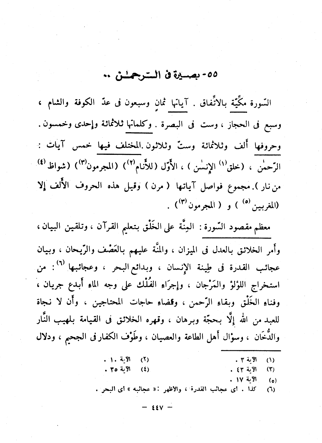السّورة مكِّيّة بالاتِّفاق. آياتها ثمانٍ وسبعون فى عدّ الكوفة والشام، وسبع فى الحجاز، وست فى البصرة. وكلماتها ثلاثمائة وإِحدى وخمسون. وحروفها أَلف وثلاثمائة وستّ وثلاثون. المختلف فيها خمس آيات: الرّحمن، {خَلَقَ الإنسان} ، الأوّل {لِلأَنَامِ} {الْمُجْرِمُوْنَ} {شُوَاظٌ مِّن نَّارٍ} . مجموع فواصل آياتها (مرن) وقيل هذه الحروف الأَلف إِلا {الْمَغْرِبَيْنِ} و {الْمُجْرِمُوْنَ} .