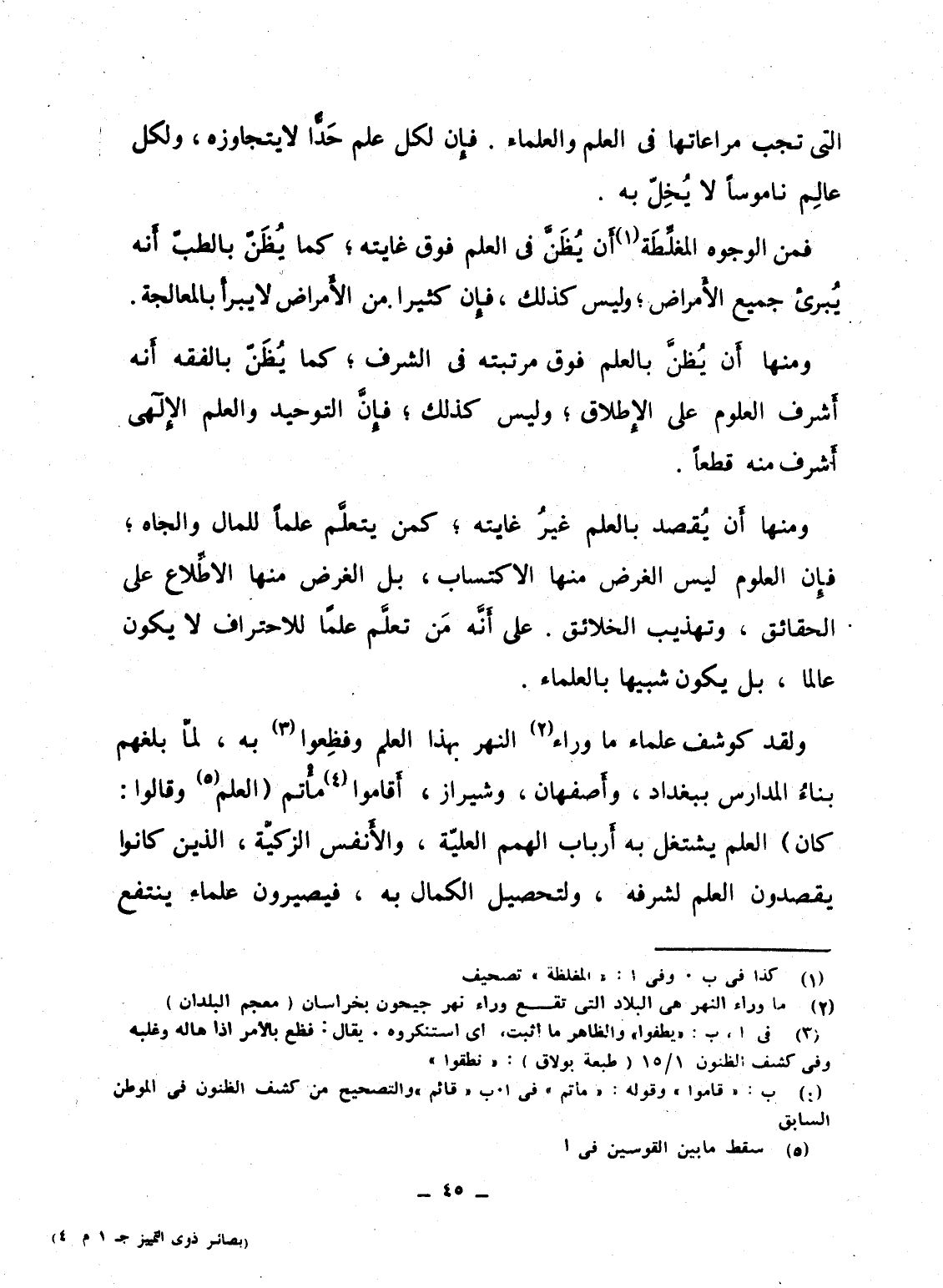 ومنها أَن يُقصد بالعلم غيرُ غايته؛ كمن يتعلَّم علماً للمال والجاه؛ فإِن العلوم ليس الغرض منها الاكتساب، بل الغرض منها الاطِّلاع على الحقائق، وتهذيب الخلائق. على أَنَّه مَن تعلَّم علماً للاحتراف لا يكون عالما، بل يكون شبيها بالعلماء.