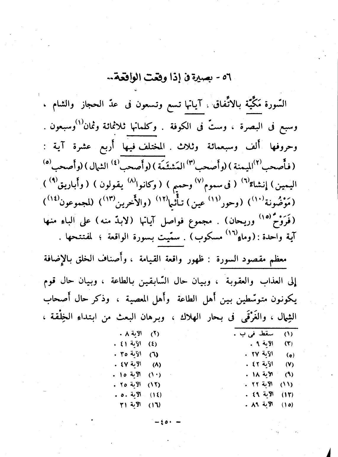 السّورة مَكِّيّة بالاتِّفاق. آياتها تسع وتسعون فى عدّ الحجاز والشام، وسبع فى البصرة، وستّ فى الكوفة. وكلماتها ثلاثمائة وثمان وسبعون. وحروفها أَلف وسبعمائة وثلاث. المختلف فيها أَربع عشرة آية: {فَأَصْحَابُ الميمنة} {وَأَصْحَابُ المشأمة} {وَأَصْحَابُ الشمال} {وَأَصْحَابُ اليمين} إنشاءً {فِي سَمُوْمٍ وَحَمِيمٍ} {وَكَانُواْ يِقُولُونَ} {وَأَبَارِيقَ} {مَّوْضُونَةٍ} {وَحُورٌ عِينٌ} تأْثيما {والآخرين} {لَمَجْمُوْعُونَ} {فَرَوْحٌ وَرَيْحَانٌ} . مجموع فواصل آياتها (لا بدّ منه) على الباءِ منها آية واحدة: {وَمَآءٍ مَّسْكُوبٍ} . سمّيت بسورة الواقعة؛ لمفتتحها.