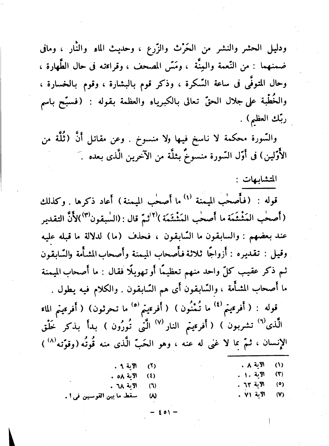 ودليل الحشر والنشر من الحَرْث والزّرع، وحديث الماءِ والنَّار، وما فى ضمنهما: من النّعمة والمِنَّة، ومَسّ المصحف، وقراءَته فى حال الطَّهارة، وحال المتوفَّى فى ساعة السّكرة، وذكر قوم بالبشارة، وقوم بالخسارة، والخُطْبة على جلال الحقّ تعالى بالكبرياءِ والعظمة بقوله: {فَسَبِّحْ باسم رَبِّكَ العظيم} .