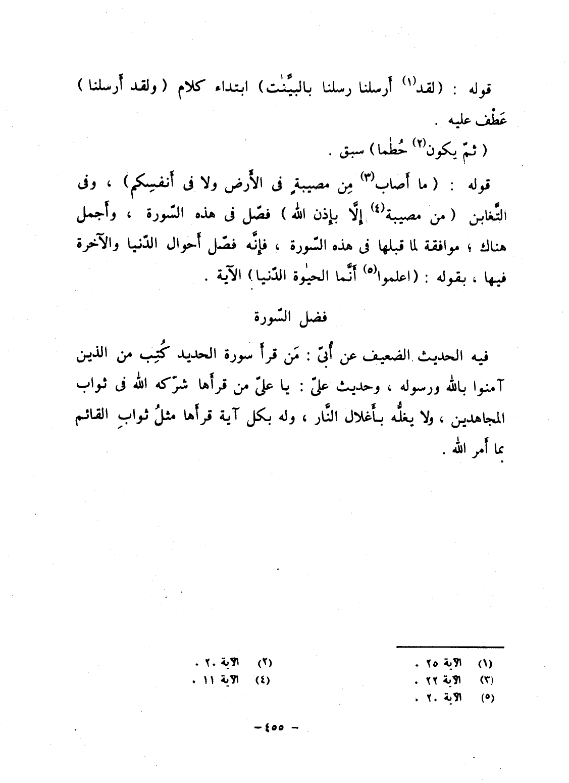 فيه الحديث الضعيف عن أُبىّ: مَن قرأَ سورة الحديد كُتِب من الذين آمنوا بالله ورسوله، وحديث علىّ: يا علىّ من قرأَها شرّكه الله فى ثواب المجاهدين، ولا يغلُّه بأَغلال النَّار، وله بكل آية قرأَها مثلُ ثوابِ القائم بما أَمر الله.