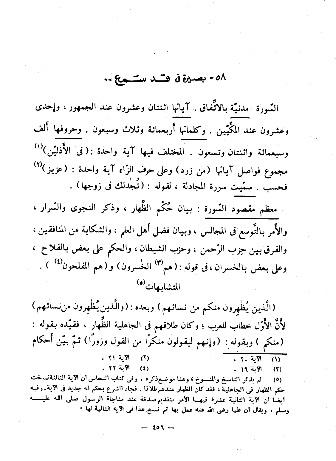 السّورة مدنيّة بالاتِّفاق. آياتها اثنتان وعشرون عند الجمهور، وإِحدى وعشرون عند المكِّيّين. وكلماتها أَربعمائة وثلاث وسبعون. وحروفها أَلف وسبعمائة واثنتان وتسعون. المختلف فيها آية واحدة: {فِي الأذلين} مجموع فواصل آياتها (من زرد) وعلى حرف الزّاءِ آية واحدة: {عَزِيْزٌ} فحسب. سمّيت سورة المجادلة، لقوله: {تَجَادِلُكَ فِي زَوْجِهَا} .