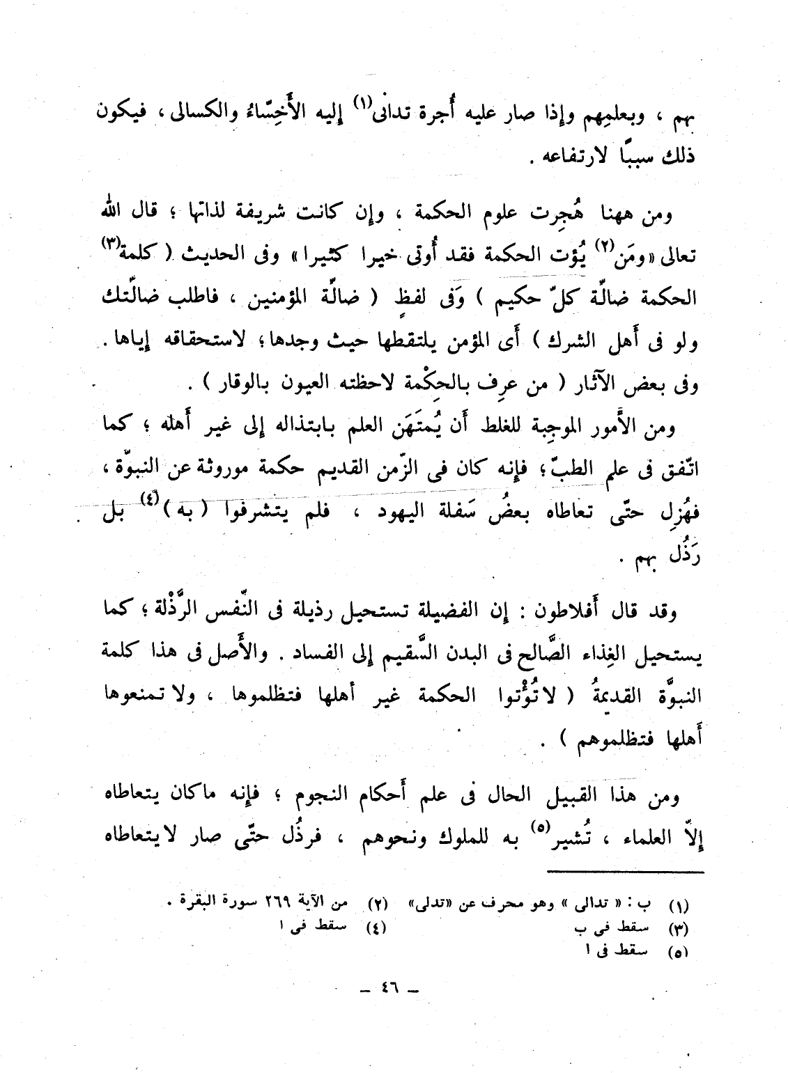 ومن هاهنا هُجِرت علوم الحكمة، وإِن كانت شريفة لذاتها؛ قال الله تعالى {وَمَن يُؤْتَ الْحِكْمَةَ فَقَدْ أُوتِيَ خَيْراً كَثِيراً} وفى الحديث "كلمة الحكمة ضالّة كلّ حكيم" وَفى لفظٍ "ضالّة المؤمنين، فاطلب ضالّتك ولو فى أَهل الشرك" أَى المؤمن يلتقطها حيث وجدها، لاستحقاقه إِياها. وفى بعض الآثار (من عرِف بالحِكْمة لاحظته العيون بالوقار) .