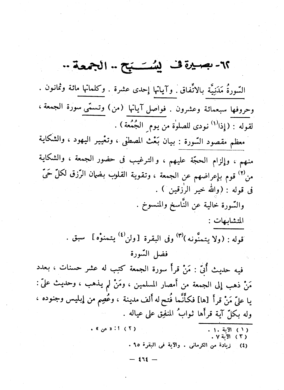 فيه حديث أُبىّ: مَنْ قرأَ سورة الجمعة كتِب له عشر حسنات، بعدد مَنْ ذهب إِلى الجمعة من أَمصار المسلمين، ومَنْ لم يذهب، وحديث علىّ: يا علىّ مَنْ قرأَ [ها] فكأَنَّما فُتح له أَلف مدينة، وعُصِم من إِبليس وجنوده، وله بكلّ آية قرأَها ثوابُ المنفِق على عياله.