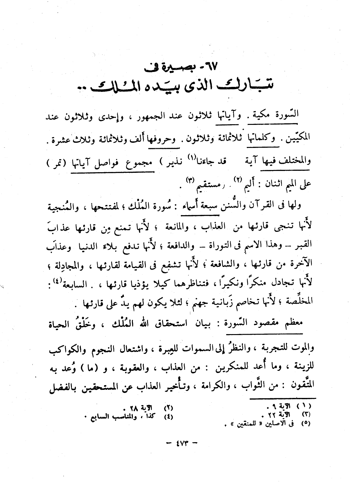معظم مقصود السّورة: بيان استحقاق الله المُلْك، وخَلْقُ الحياة والموت للتجربة، والنظرُ إِلى السماوات للعِبرة، واشتعال النجوم والكواكب للزينة، وما أُعد للمنكرين: من العذاب، والعقوبة، و (ما) وُعد به المتَّقون: من الثَّواب، والكرامة، وتأْخير العذاب عن المستحقين بالفضل