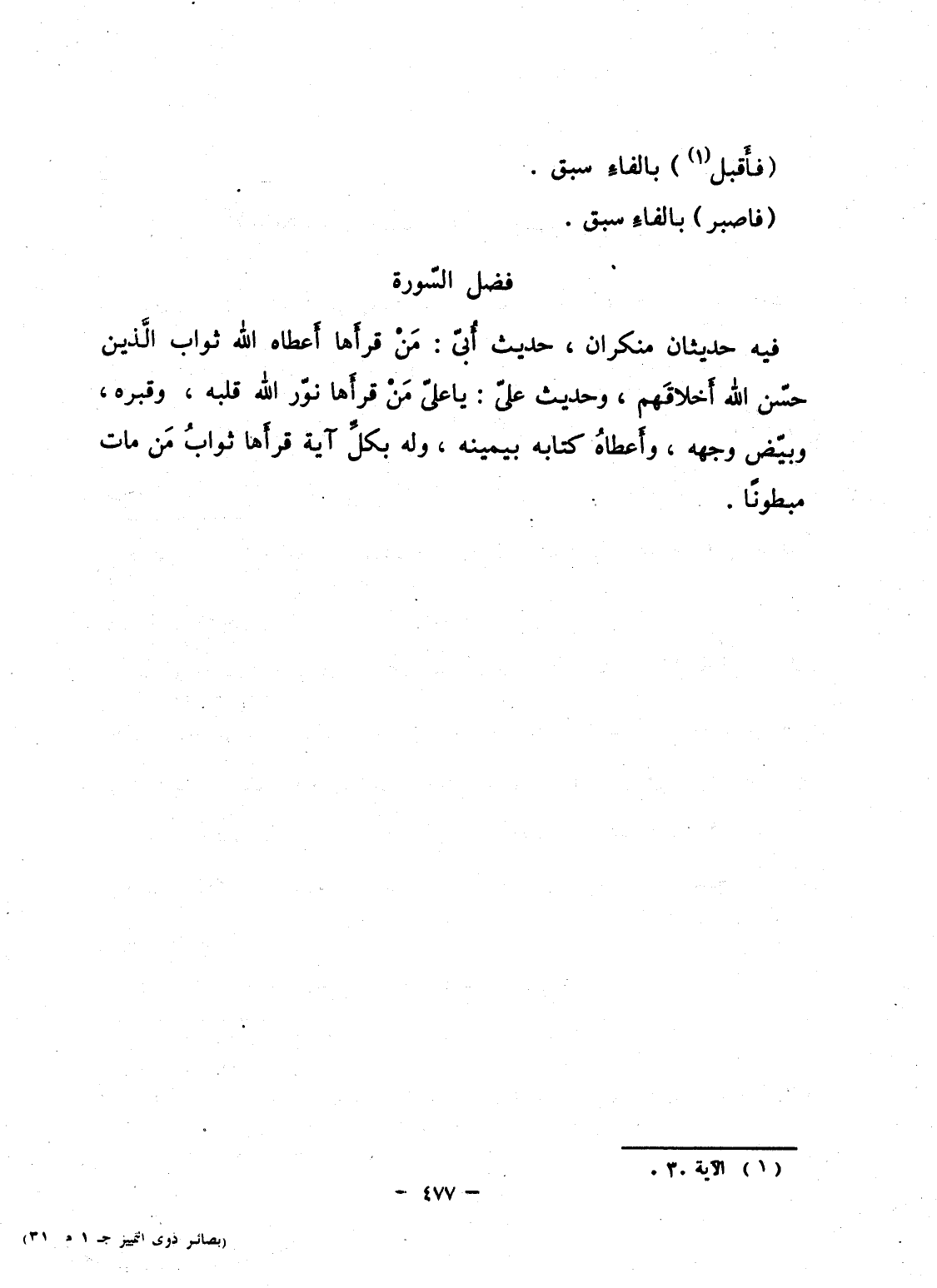 فيه حديثان منكران، حديث أُبىّ: مَنْ قرأَها أَعطاه الله ثواب الَّذين حسّن الله أَخلاقَهم، وحديث علىّ: يا علىّ مَنْ قرأَها نوّر الله قلبه، وقبره، وبيّض وجهه، وأَعطاهُ كتابه بيمينه، وله بكلِّ آية قرأَها ثوابُ مَن مات مبطوناً.
