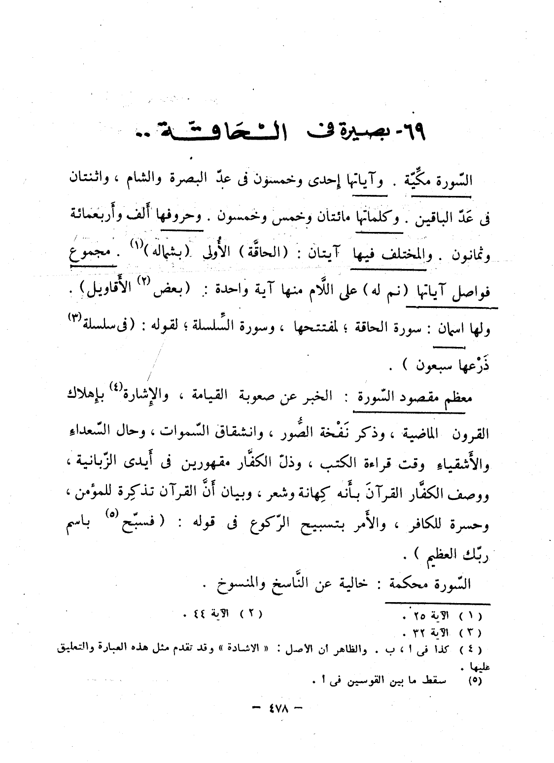 السّورة مكِّيّة. وآياتها إِحدى وخمسون فى عدّ البصرة والشام، واثنتان فى عَدّ الباقين. وكلماتها مائتان وخمس وخمسون. وحروفها أَلف وأَربعمائة وثمانون. والمختلف فيها آيتان: {الحَآقَّةُ} الأُولى {بِشِمَالِهِ} . مجموع فواصل آياتها (نم له) على اللاَّم منها آية واحدة: {بَعْضَ الأقاويل} . ولها اسمان: سورة الحاقة؛ لمفتتحها، وسورة السِّلسلة؛ لقوله: {فِي سِلْسِلَةٍ ذَرْعُهَا سَبْعُونَ} .