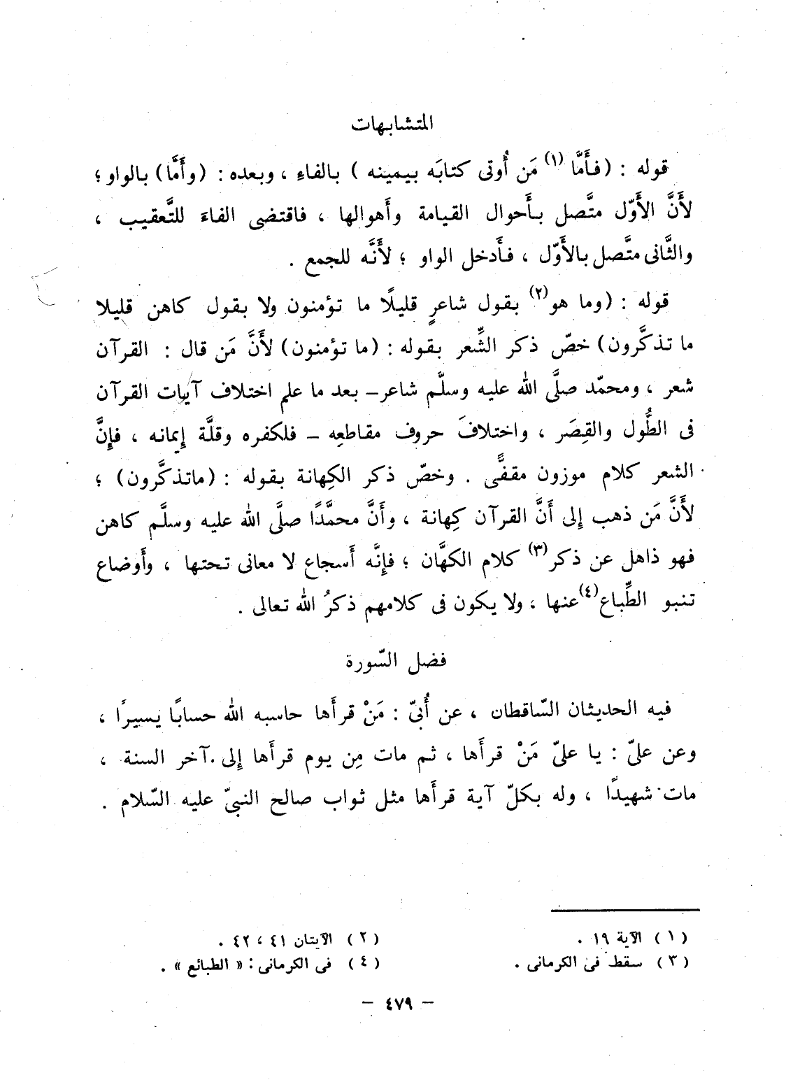 فيه الحديثان السّاقطان. عن أُبىّ: مَنْ قرأَها حاسبه الله حساباً يسيراً، وعن علىّ: يا علىّ مَنْ قرأَها، ثم مات مِن يوم قرأَها إِلى آخر السنة، مات شهيداً، وله بكلّ آية قرأَها مثل ثواب صالح النبىّ عليه السّلام.