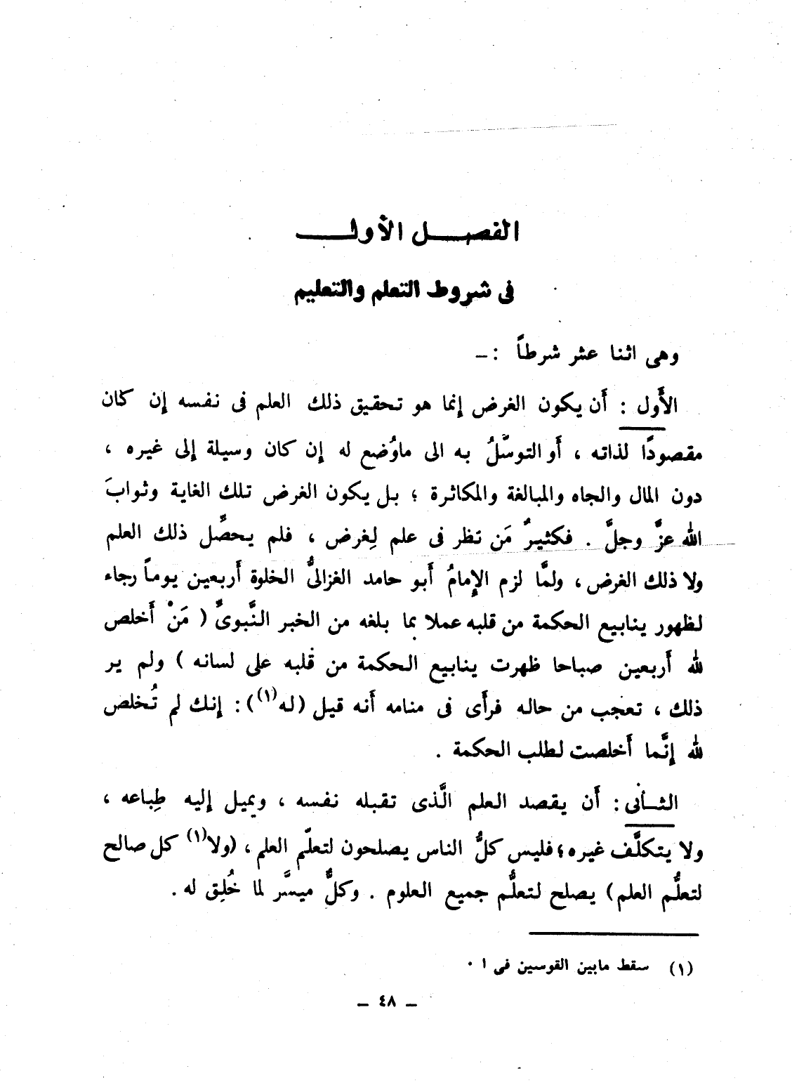 الأَول: أَن يكون الغرض إِنما هو تحقيق ذلك العلم فى نفسه إِن كان مقصوداً لذاته، أَو التوسّلُ به إلى ما وُضع له إِن كان وسيلة إِلى غيره، دون المال والجاه والمبالغة والمكاثرة؛ بل يكون الغرض تلك الغاية وثوابَ الله عزَّ وجلَّ. فكثيرٌ مَن نظر فى علم لِغرض، فلم يحصِّل ذلك العلم ولا ذلك الغرض، ولمَّا لزم الإِمامُ أَبو حامد الغزالىُّ الخلوة أَربعين يوماً رجاء لظهور ينابيع الحكمة من قلبه عملا بما بلغه من الخبر النَّبوىِّ "مَنْ أَخلص لله أَربعين صباحاً ظهرت ينابيع الحكمة من قلبه على لسانه" ولم ير ذلك، تعجب من حاله فرأَى فى منامه أَنه قيل (له) : إِنك لم تُخلص لله إِنَّما أَخلصت لطلب الحكمة.