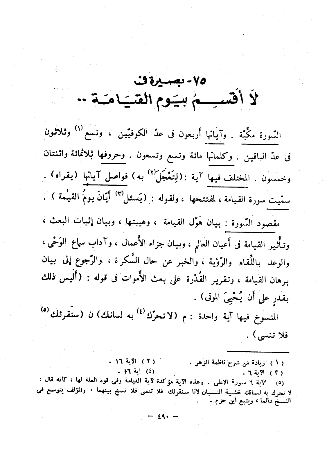 السّورة مكِّيّة. وآياتها أَربعون فى عدّ الكوفيّين، وتسع وثلاثون فى عدّ الباقين. وكلماتها مائة وتسع وتسعون. وحروفها ثلاثمائة واثنتان وخمسون. المختلف فيها آية: {لِتَعْجَلَ بِهِ} فواصل آياتها (يقراه) . سمّيت سورة القيامة، لمفتتحها، ولقوله: {يَسْأَلُ أَيَّانَ يَوْمُ القيامة} .