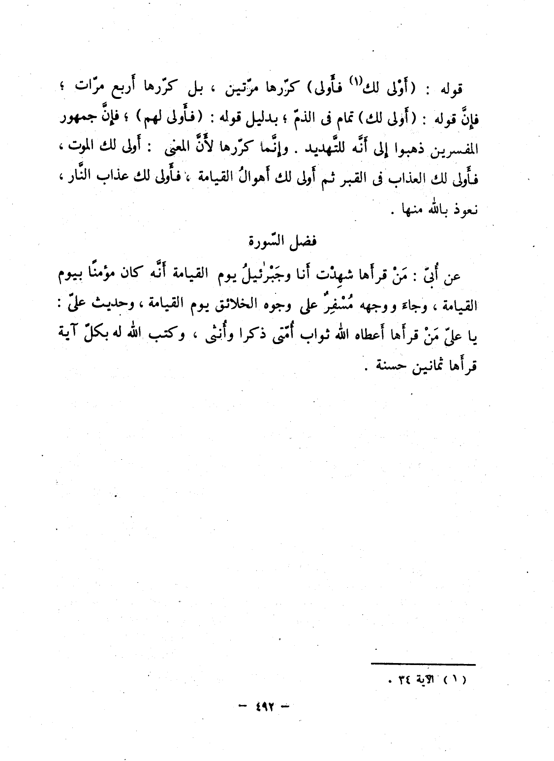 قوله: {أولى لَكَ فأولى} كرّرها مرّتين، بل كرّرها أَربع مرّات؛ فإِنَّ قوله: {أولى لَكَ} تمام فى الذمّ؛ بدليل قوله: {فأولى لَهُم} ؛ فإِنَّ جمهور المفسرين ذهبوا إِلى أَنَّه للتَّهديد. وإِنَّما كرّرها لأَنَّ المعنى: أَولى لك الموت، فأَولى لك العذاب فى القبر ثمّ أَولى أَهوالُ القيامة، فأَولى لك عذاب النَّار، نعوذ بالله منها.