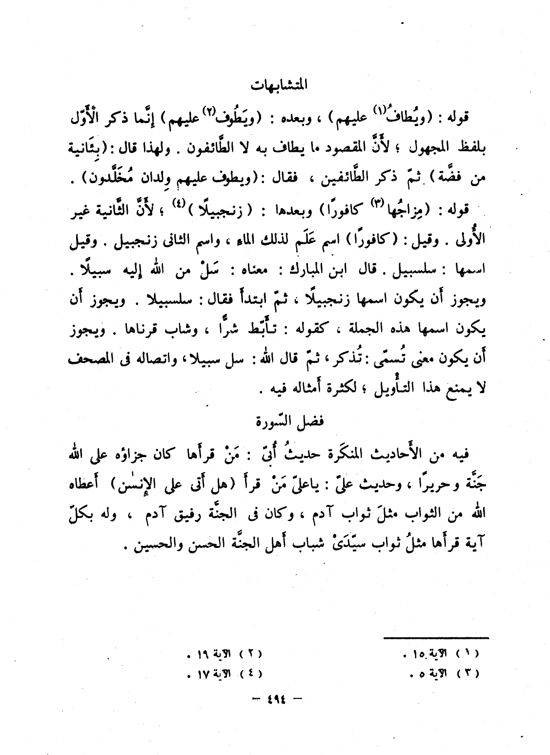 فيه من الأَحاديث المنكَرة حديثُ أُبىّ: مَنْ قرأَها كان جزاؤه على الله جَنَّة وحريراً، وحديث علىّ: يا علىّ مَنْ قرأَ {هَلْ أتى عَلَى الإنسان} أَعطاه الله من الثواب مثلَ ثواب آدم، وكان فى الجنَّة رفيق آدم، وله بكلّ آية قرأَها مثلُ ثواب سيّدَىْ شباب أَهل الجنَّة الحسن والحسين.