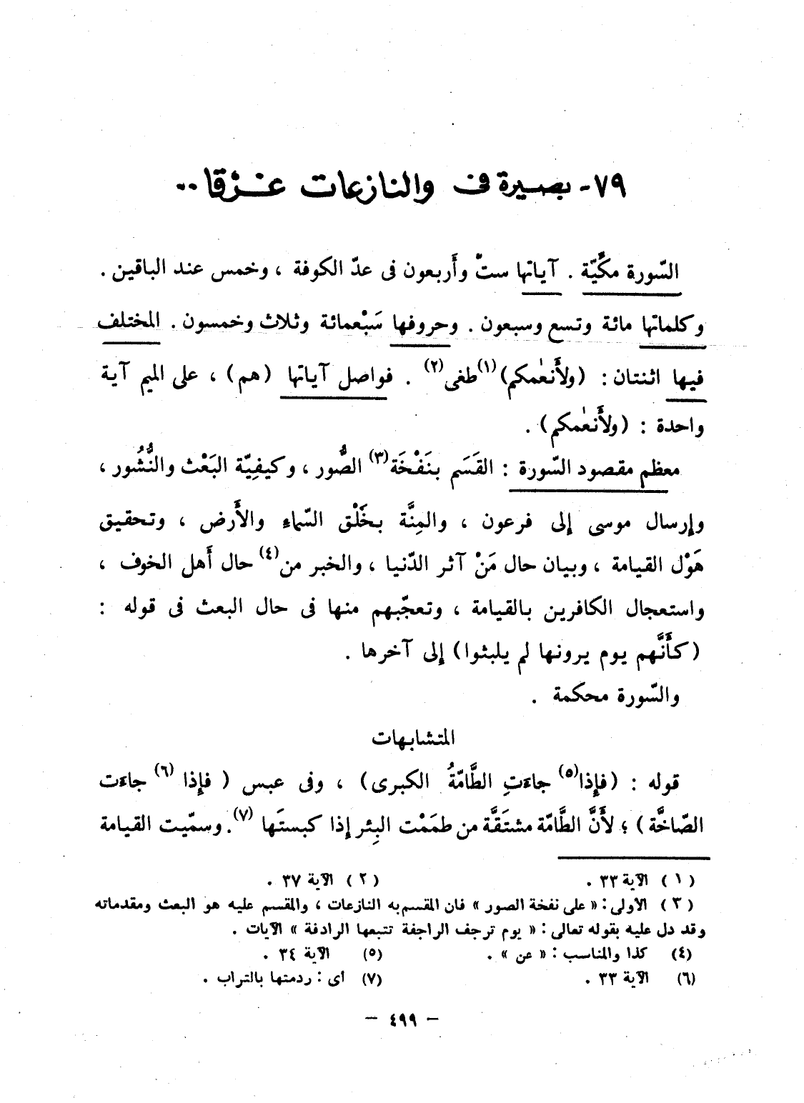 السّورة مكِّيّة. آياتها ستّ وأَربعون فى عدّ الكوفة، وخمس عند الباقين. وكلماتها مائة وتسع وسبعون. وحروفها سَبْعمائة وثلاث وخمسون. المختلف فيها اثنتان: {وَلأَنْعَامِكُمْ} طغى. فواصل آياتها (هم) ، على الميم آية واحدة: {وَلأَنْعَامِكُمْ} .