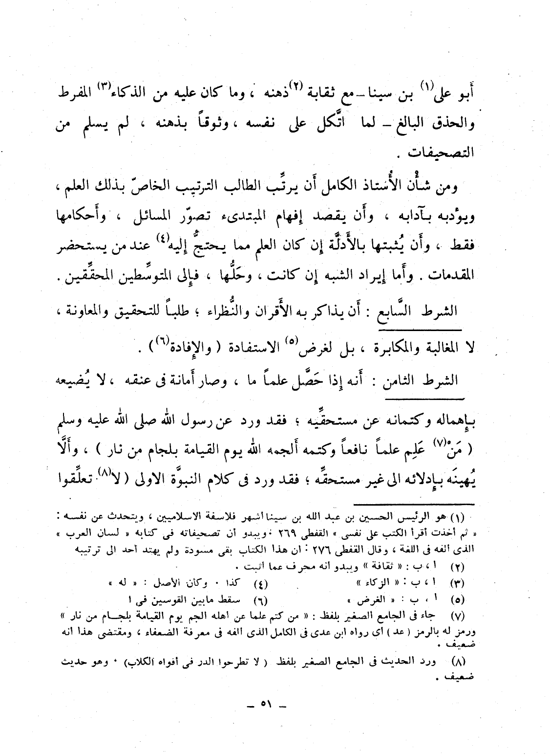 الشرط الثامن: أَنه إِذا حَصَّل علماً ما، وصار أَمانة فى عنقه، لا يُضيعه بإِهماله وكتمانه عن مستحقِّيه؛ فقد ورد عن رسول الله صلى الله عليه وسلم: "مَنْ عَلِم علماً نافعاً وكتمه أَلجمه الله يوم القيامة بلجام من نار"، وأَلاَّ يُهينَه بإِدلائه إلى غير مستحقِّه؛ فقد ورد فى كلام النبوَّة الأولى "لا تعلِّقوا