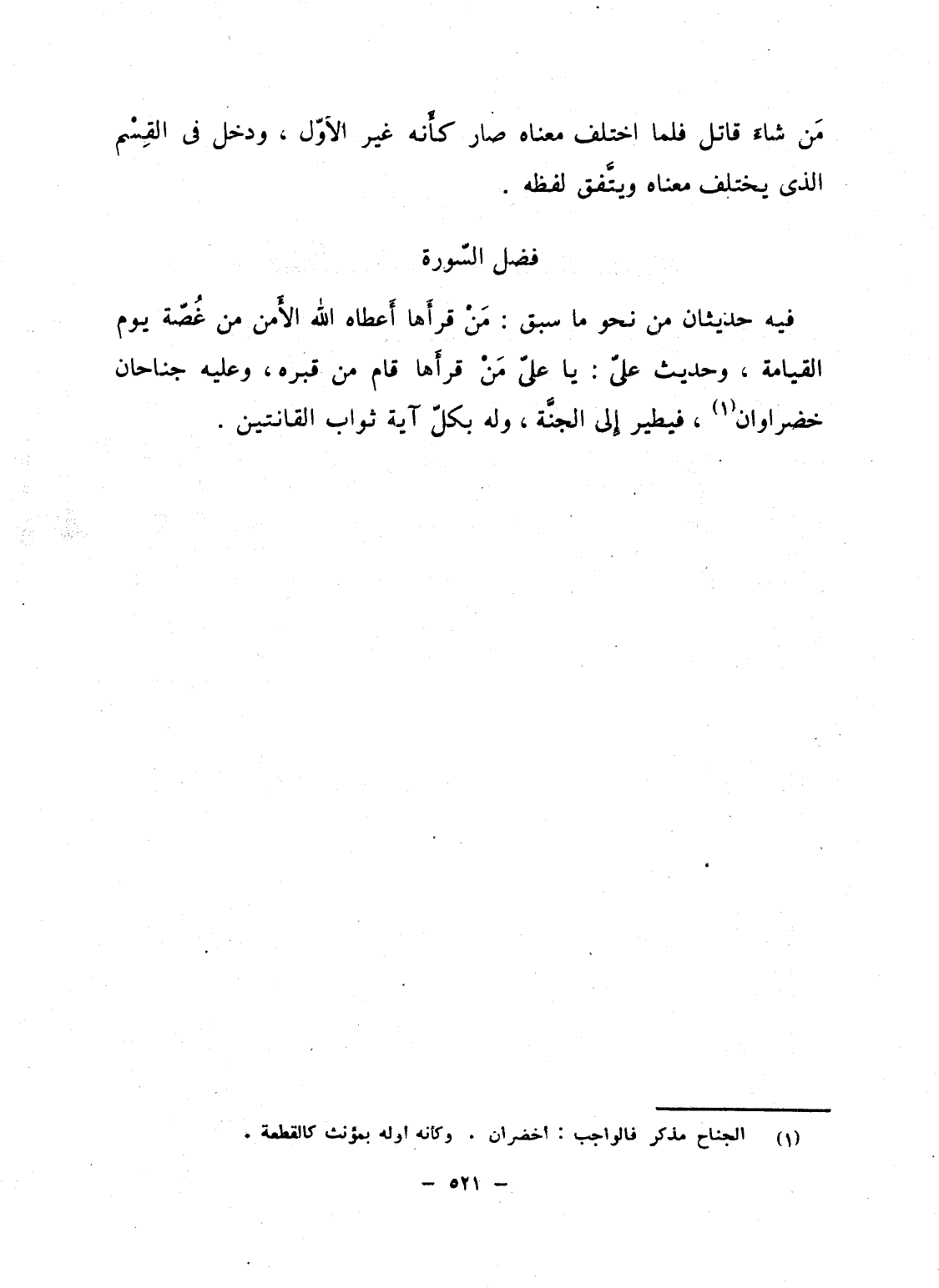 فيه حديثان من نحو ما سبق: مَنْ قرأَها أَعطاه الله الأَمن من غُصّة يوم القيامة، وحديث علىّ: يا علىّ مَنْ قرأَها قام من قبره، وعليه جناحان خضراوان، فيطير إِلى الجنَّة، وله بكلّ آية ثواب القانتين.