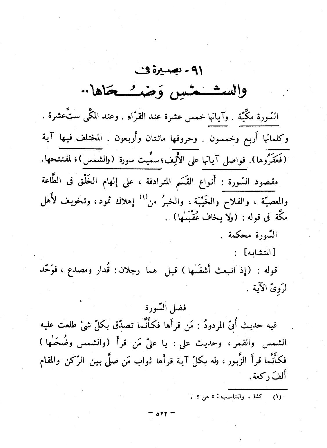فيه حديث أُبىّ المردودُ: مَن قرأَها فكأَنَّما تصدّق بكلّ شىء طلعت عليه الشمس والقمر، وحديث على: يا علىّ مَن قرأَ {والشمس وَضُحَاهَا} فكأَنَّما قرأَ الزَّبور، وله بكلّ آية قرأَها ثواب مَن صلَّى بين الرّكن والمقام أَلفَ ركعة.