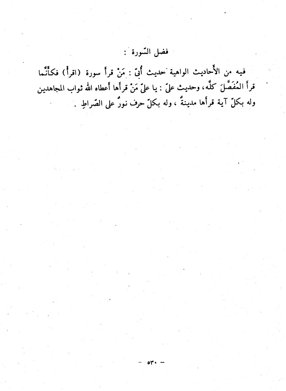 فيه من الأَحاديث الواهية حديث أُبىّ: مَنْ قرأَ سورة (اقرأَ) فكأَنَّما قرأَ المُفَصَّلَ كلَّه، وحديث علىّ: يا علىّ مَنْ قرأَها أَعطاه الله ثواب المجاهدين وله بكلّ آية قرأَها مدينةٌ، وله بكلّ حرف نورٌ على الصّراطِ.