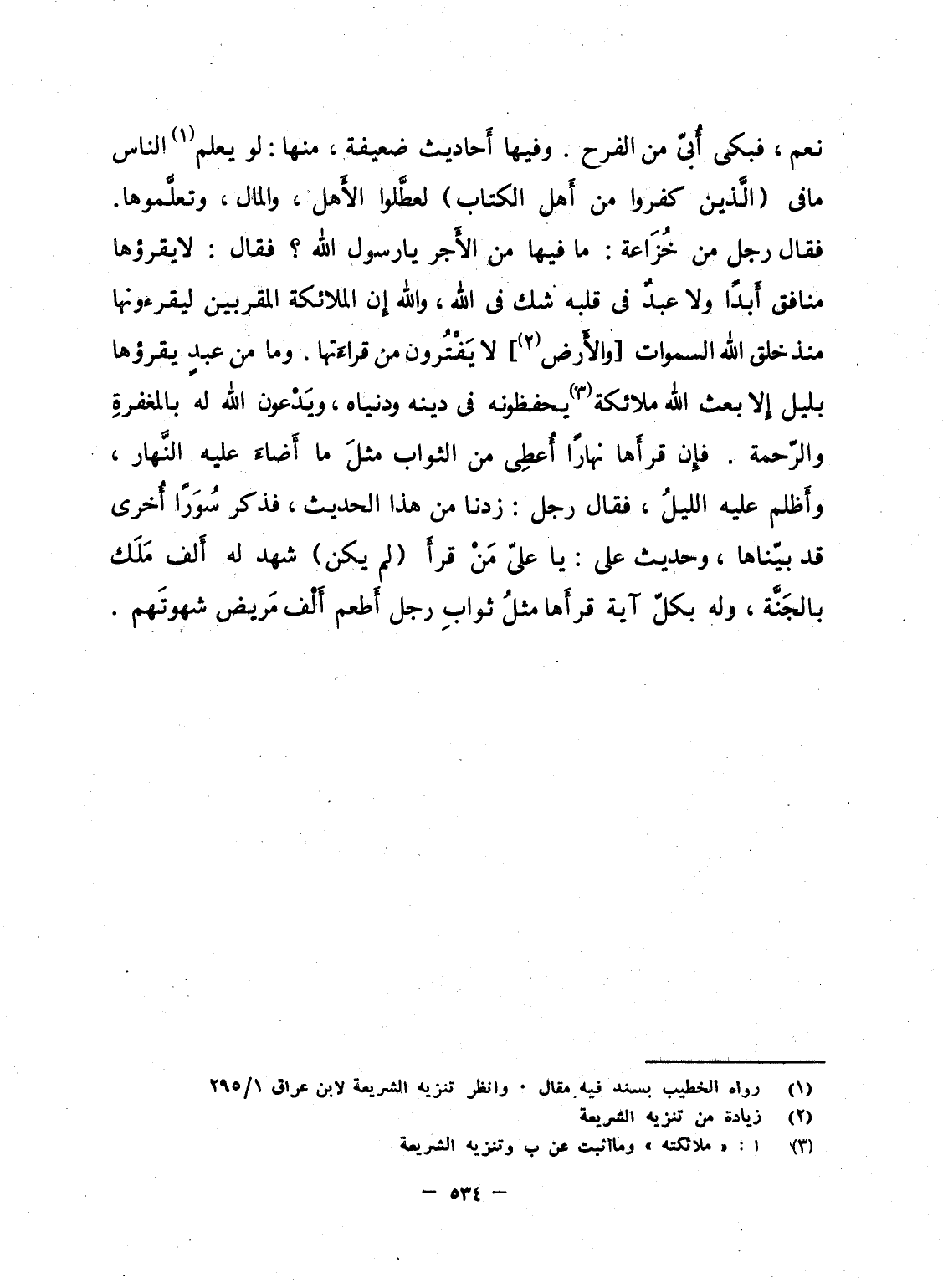 نعم، فبكى أُبىّ من الفرح. وفيها أَحاديث ضعيفة، منها: لو يعلم الناس ما فى {الذين كَفَرُواْ مِنْ أَهْلِ الكتاب} لعطَّلوا الأَهل، والمال، وتعلَّموها. فقال رجل من خُزَاعة: ما فيها من الأَجر يا رسول الله؟ فقال: لا يقرؤها منافق أَبداً ولا عبدٌ فى قلبه شك فى الله، والله إِن الملائكة المقربين ليقرءونها منذ خلق الله السماوات [والأَرض] لا يَفْتُرون من قراءَتها. وما من عبدٍ يقرؤها بليل إِلا بعث الله ملائكة يحفظونه فى دينه ودنياه، ويَدْعون الله له بالمغفرةِ والرّحمة. فإِن قرأَها نهاراً أُعطِى من الثواب مثلَ ما أَضاءَ عليه النَّهار، وأَظلم عليه الليلُ، فقال رجل: زدنا من هذا الحديث، فذكر سُوَراً أُخرى قد بيّناها، وحديث على: يا علىّ مَنْ قرأَ (لم يكن) شهد له أَلف مَلَك بالجَنَّة، وله بكلّ آية قرأَها مثلُ ثوابِ رجل أَطعم أَلْف مَريض شهوتَهم.