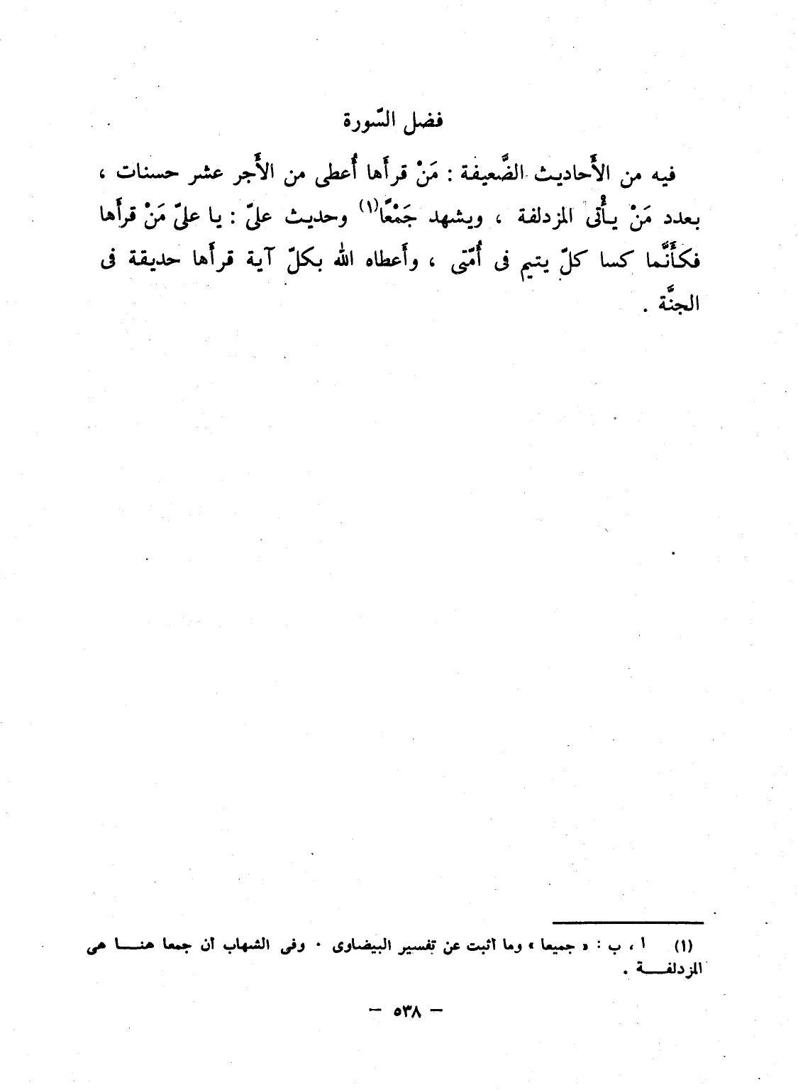 فيه من الأَحاديث الضَّعيفة: مَنْ قرأَها أُعطى من الأَجر عشر حسنات، بعدد مَنْ يأْتى المزدلفة، ويشهد جَمْعاً وحديث علىّ: يا علىّ مَنْ قرأَها فكأَنَّما كسا كلّ يتيم فى أُمّتى، وأَعطاه الله بكلّ آية قرأَها حديقة فى الجنَّة.