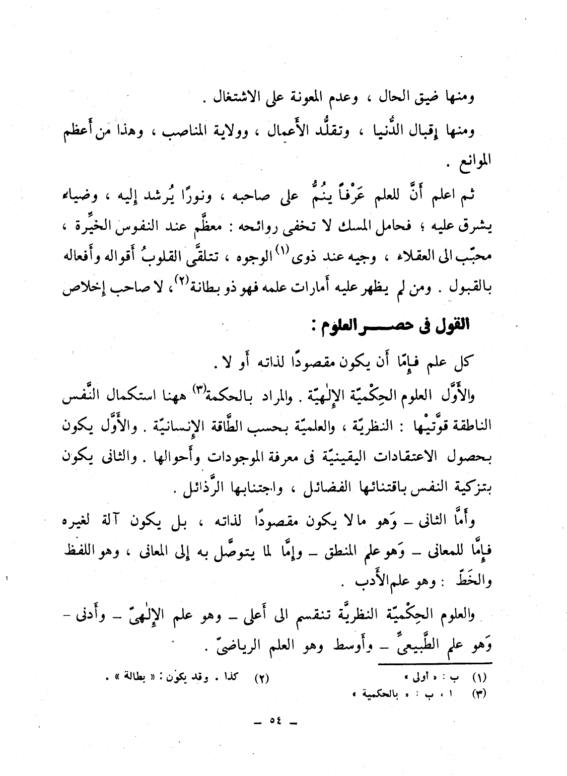 والأَوَّل العلوم الحِكْميّة الإلهية. والمراد بالحكمة هاهنا استكمال النَّفش الناطقة قوَّتيْها: النظريّة، والعلميّة بحسب الطَّاقة الإِنسانيّة. والأَوَّل يكون بحصول الاعتقادات اليقينيّة فى معرفة الموجودات وأَحوالها. والثانى يكون بتزكية النفس باقتنائها الفضائل، واجتنابها الرَّذائل.