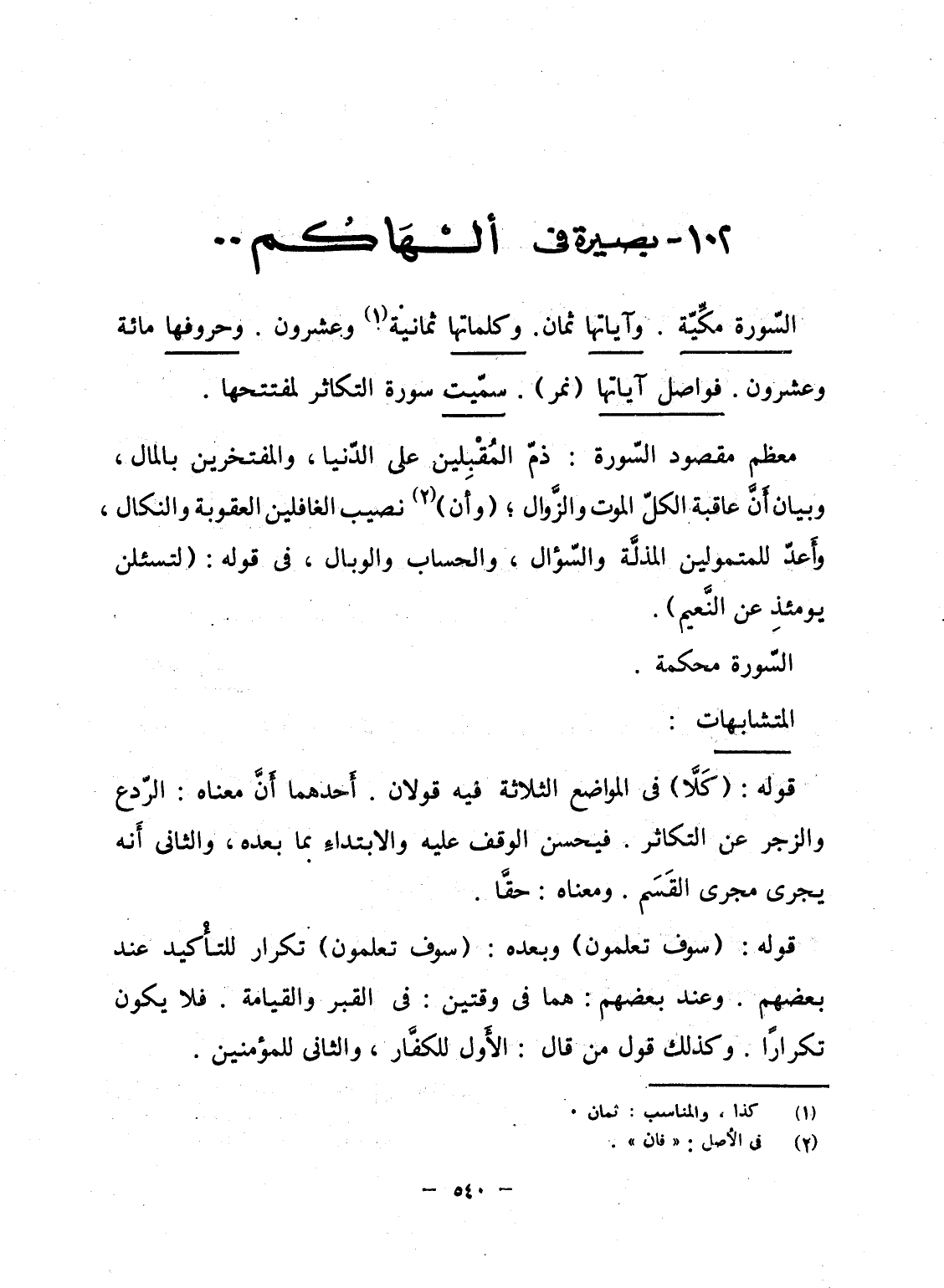 معظم مقصود السّورة: ذمّ المُقْبِلين على الدّنيا، والمفتخرين بالمال، وبيان أَنَّ عاقبة الكلّ الموت والزَّوال، (وأن) نصيب الغافلين العقوبة والنكال، وأَعدّ للمتمولين المذلَّة والسّؤال، والحساب والوبال، فى قوله: {لَتُسْأَلُنَّ يَوْمَئِذٍ عَنِ النعيم} .