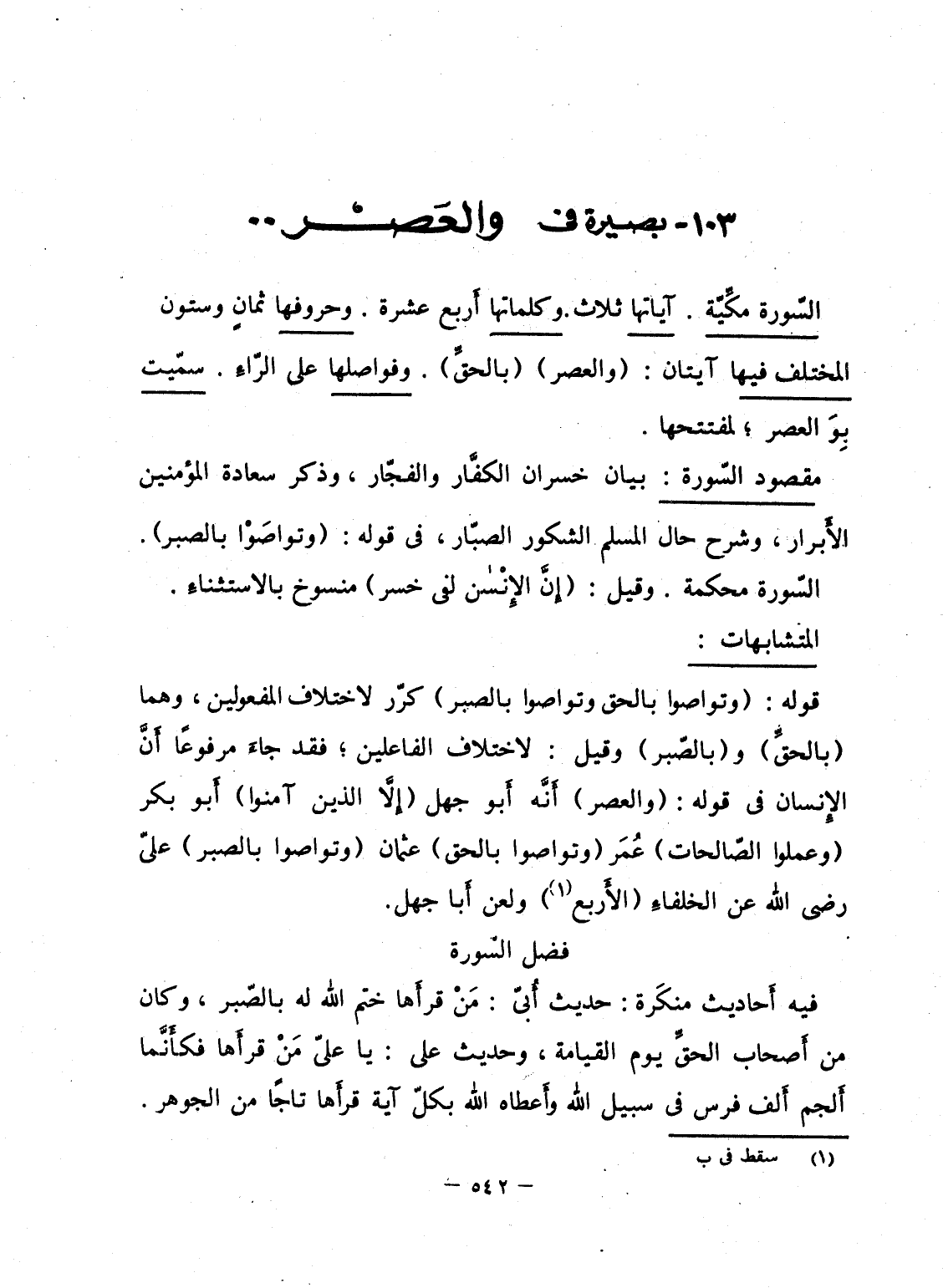 السّورة مكِّيّة. آياتها ثلاث. وكلماتها أَربع عشرة. وحروفها ثمانٍ وستون المختلف فيها آيتان: {والعصر} {بالحق} . وفواصلها على الرّاءِ. سمّيت بِوَ العصر؛ لمفتتحها.