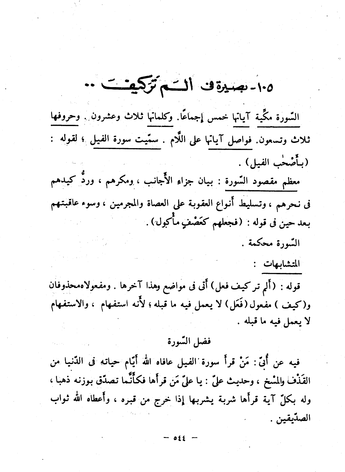فيه عن أُبىّ: مَنْ قرأَ سورة الفيل عافاه الله أَيّام حياته فى الدّنيا من القَذْف والمسْخ، وحديث علىّ: يا علىّ مَن قرأَها فكأَنَّما تصدّق بوزنه ذهبا، وله بكلّ آية قرأَها شربة يشربها إِذا خرج من قبره، وأَعطاه الله ثواب الصدّيقين.