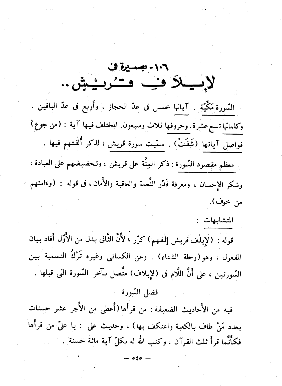 السّورة مَكِّيّة. آياتها خمس فى عدّ الحجاز، وأَربع فى عدّ الباقين. وكلماتها تسع عشرة. وحروفها ثلاث وسبعون. المختلف فيها آية: {مِنْ جُوْعٍ} فواصل آياتها (شَفَتْ) . سمّيت سورة قريش؛ لذكر أُلفتهم فيها.