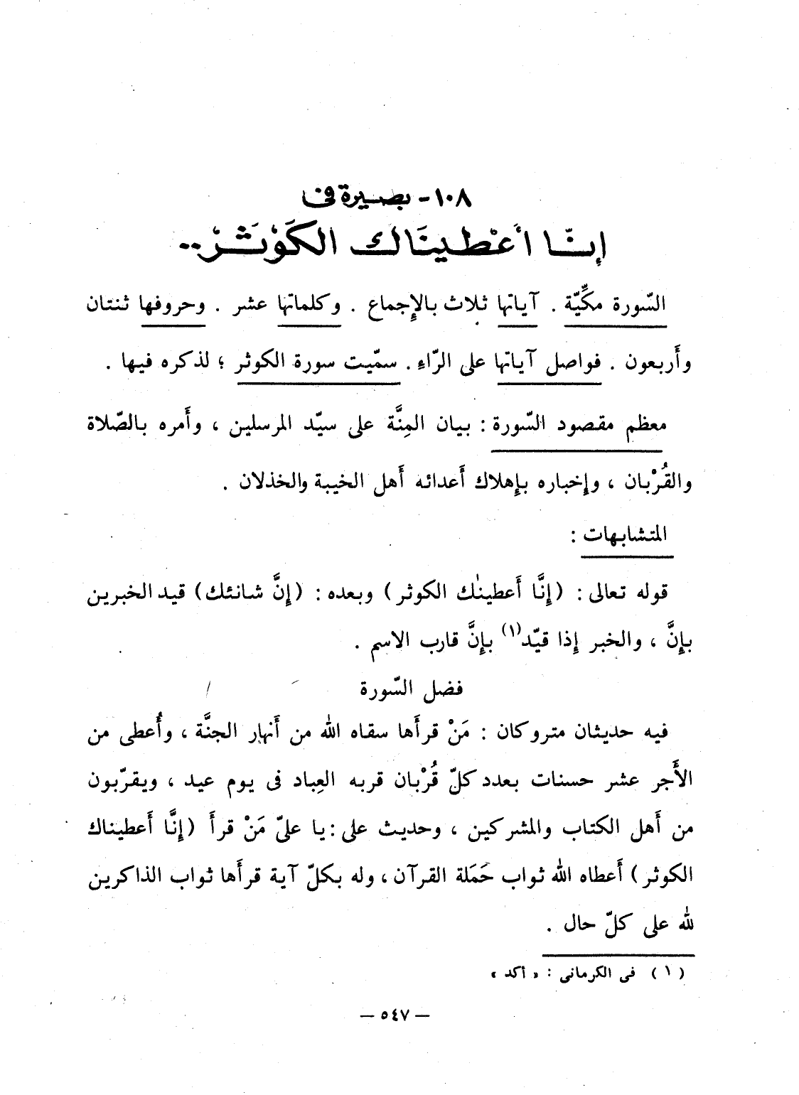 السّورة مكِّيّة. آياتها ثلاث بالإِجماع. وكلماتها عشر. وحروفها ثنتان وأَربعون. فواصل آياتها على الرّاءِ. سمّيت سورة الكوثر؛ لذكره فيها.
