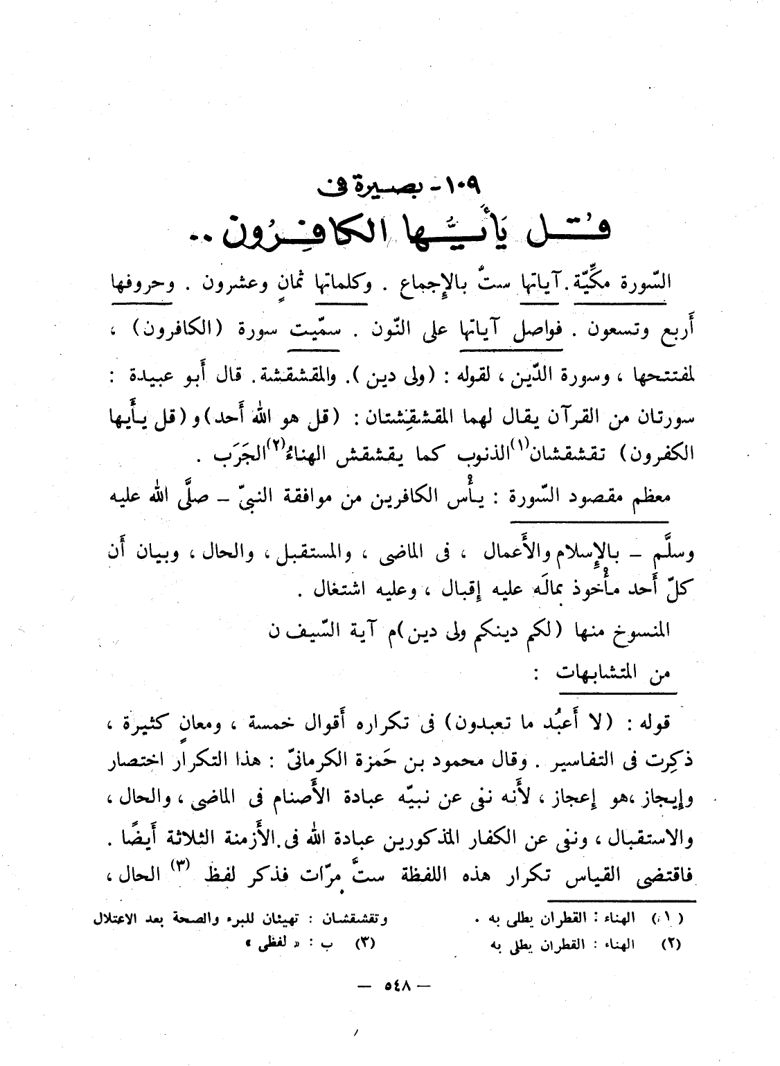 قوله: {لاَ أَعْبُدُ مَا تَعْبُدُونَ} فى تكراره أَقوال خمسة، ومعانٍ كثيرة، ذكِرت فى التفاسير. وقال محمود بن حَمزة الكرمانىّ: هذا التكرار اختصار وإِيجاز، هو إِعجاز، لأَنه نفى عن نبيّه عبادة الأَصنام فى الماضى، والحال، والاستقبال، ونفى عن الكفار المذكورين عبادة الله فى الأَزمنة الثلاثة أَيضاً. فاقتضى القياس تكرار هذه اللفظة ستَّ مرّات فذكر لفظ الحال،