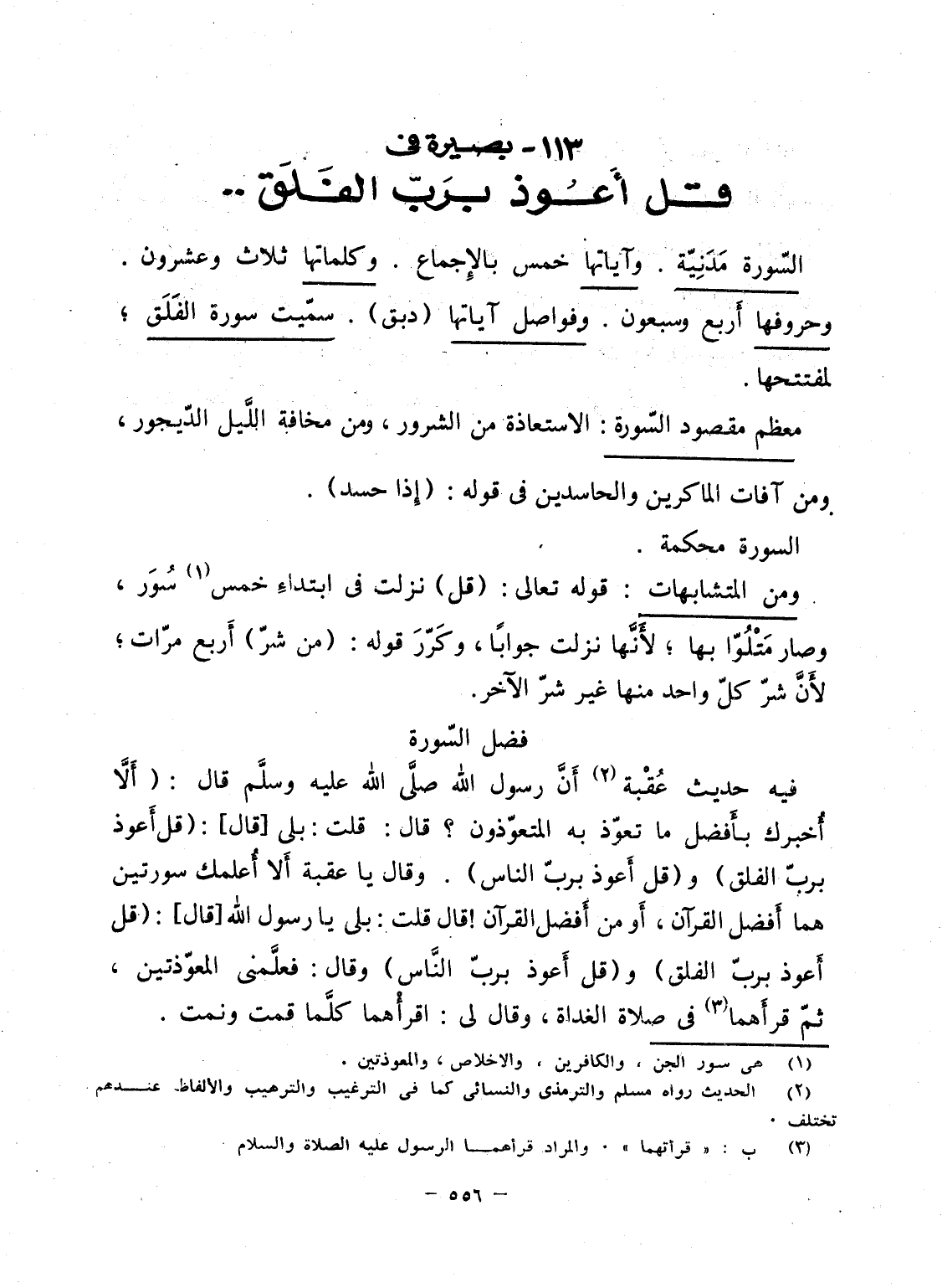 فيه حديث عُقْبة أَنَّ رسول الله صلَّى الله عليه وسلَّم قال: "أَلاَّ أُخبرك بأَفضل ما تعوّذ به المتعوّذون؟ قال: قلت: بلى [قال] : {قُلْ أَعُوذُ بِرَبِّ الفلق} و {قُلْ أَعُوذُ بِرَبِّ الناس} . وقال يا عقبة أَلا أُعلمك سورتين هما أَفضل القرآن، أَو من أَفضل القرآن! قال قلت: بلى يا رسول الله [قال] : {قُلْ أَعُوذُ بِرَبِّ الفلق} و {قُلْ أَعُوذُ بِرَبِّ الناس} وقال: فعلَّمنى المعوّذتين، ثمّ قرأَهما فى صلاة الغداة، وقال لى: اقرأْهما كلَّما قمت ونمت.