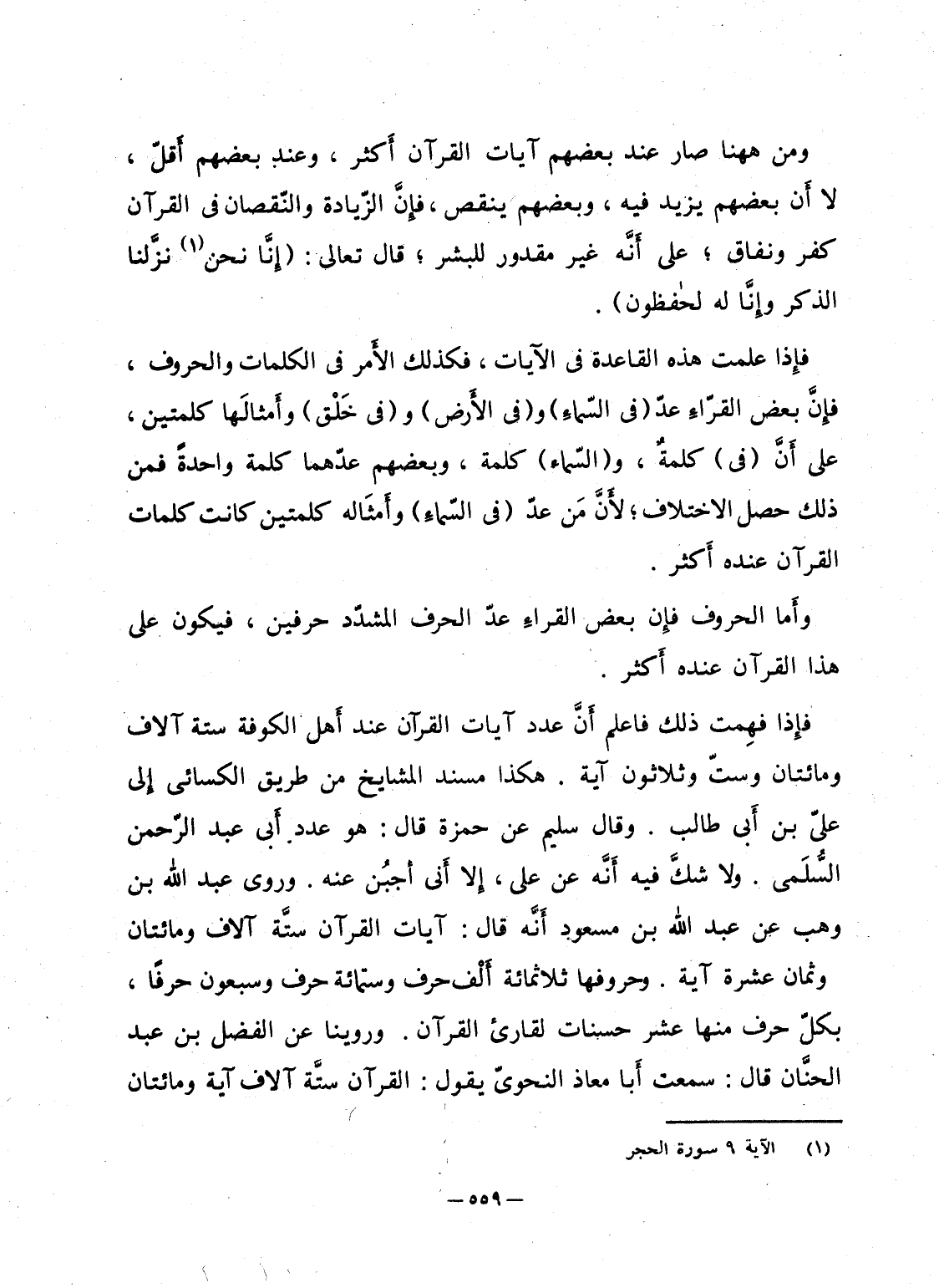 ومن هاهنا صار عند بعضهم آيات القرآن أَكثر، وعند بعضهم أَقلّ، لا أَن بعضهم يزيد فيه، وبعضهم ينقص، فإِنَّ الزّيادة والنّقصان فى القرآن كفر ونفاق؛ على أَنَّه غير مقدور للبشر؛ قال تعالى: {إِنَّا نَحْنُ نَزَّلْنَا الذكر وَإِنَّا لَهُ لَحَافِظُونَ} .