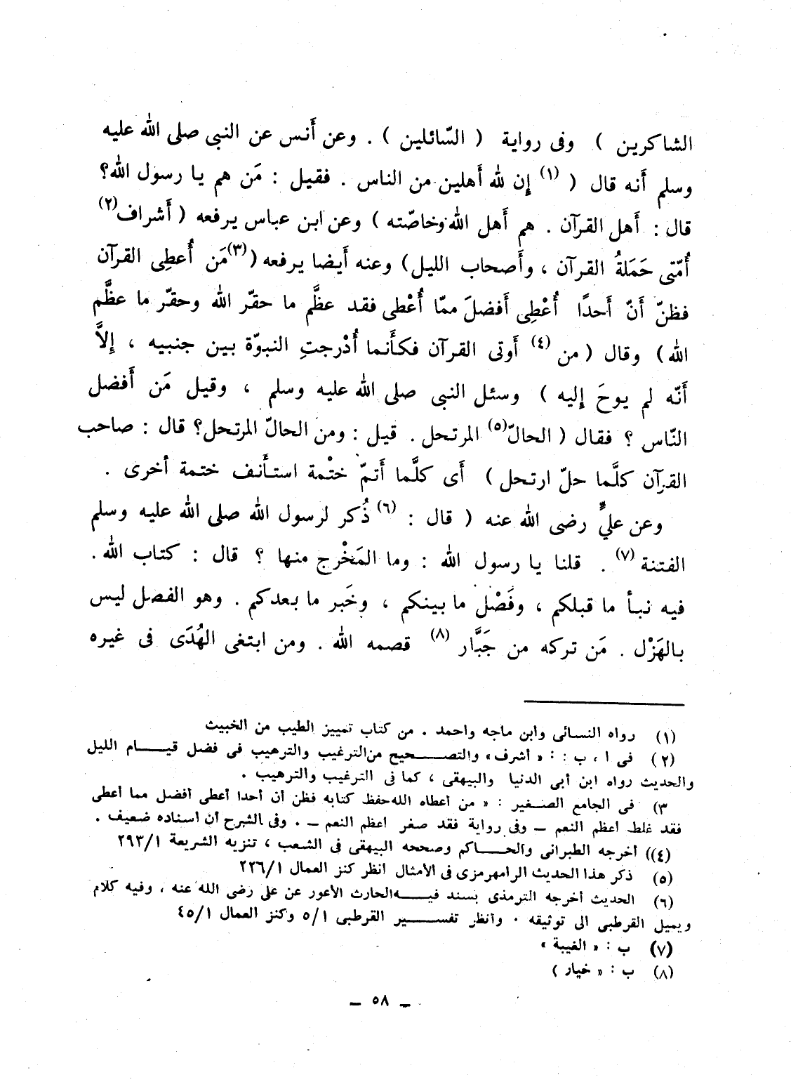 الشاكرين" وفى رواية (السّائلين) . وعن أَنس عن النبى صلى الله عليه وسلم أَنه قال "إِن لله أَهلين من الناس. فقيل: مَن هم يا رسول الله؟ قال: أَهل القرآن. هم أَهل الله وخاصّته" وعن ابن عباس يرفعه "أَشراف أُمّتى حَمَلةُ القرآن، وأَصحاب الليل" وعنه أَيضا يرفعه "مَن أُعطِى القرآن فظنّ أَنّ أَحداً أُعْطِى أَفضلَ ممّا أُعْطى فقد عظَّم ما حقّر الله وحقّر ما عظَّم الله" وقال "من أَوتى القرآن فكأَنما أُدْرجتِ النبوّة بين جنبيه، إِلاَّ أَنّه لم يوحَ إِليه" وسئل النبى صلى الله عليه وسلم، وقيل مَن أَفضل النّاس؟ فقال "الحالّ المرتحل. قيل: ومن الحالّ المرتحل؟ قال: صاحب القرآن كلَّما حلّ ارتحل" أَى كلَّما أَتمّ ختْمة استأنف ختمة أخرى.